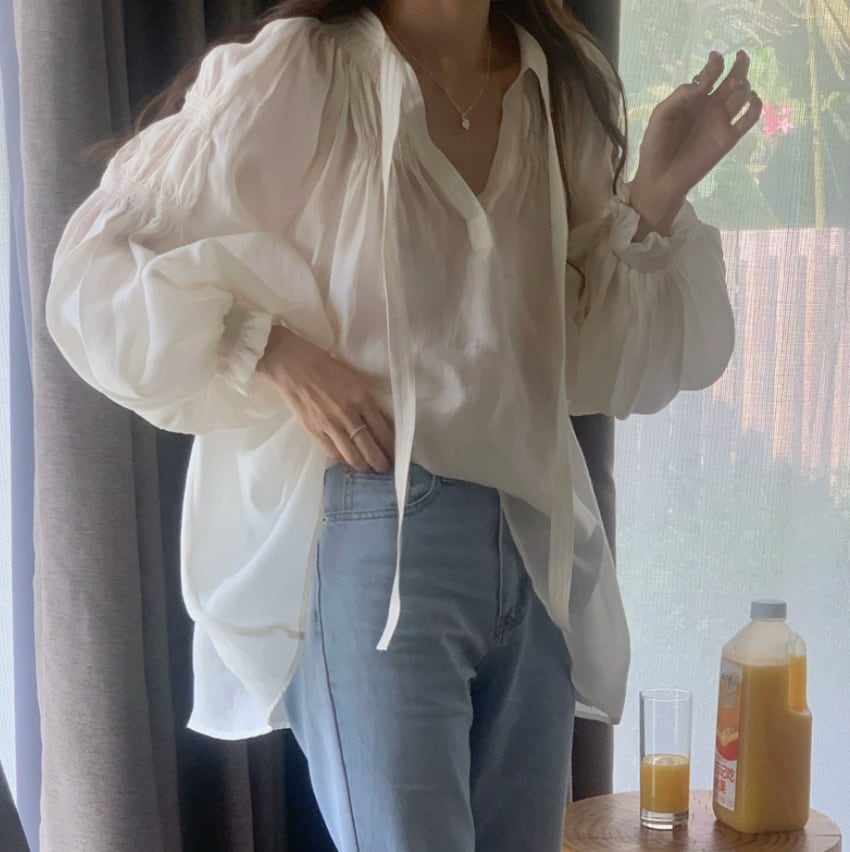 背中のボリューム感があり華やかさと動きのあるシルエットが特徴的なボリュームスリーブギャザーブラウス。