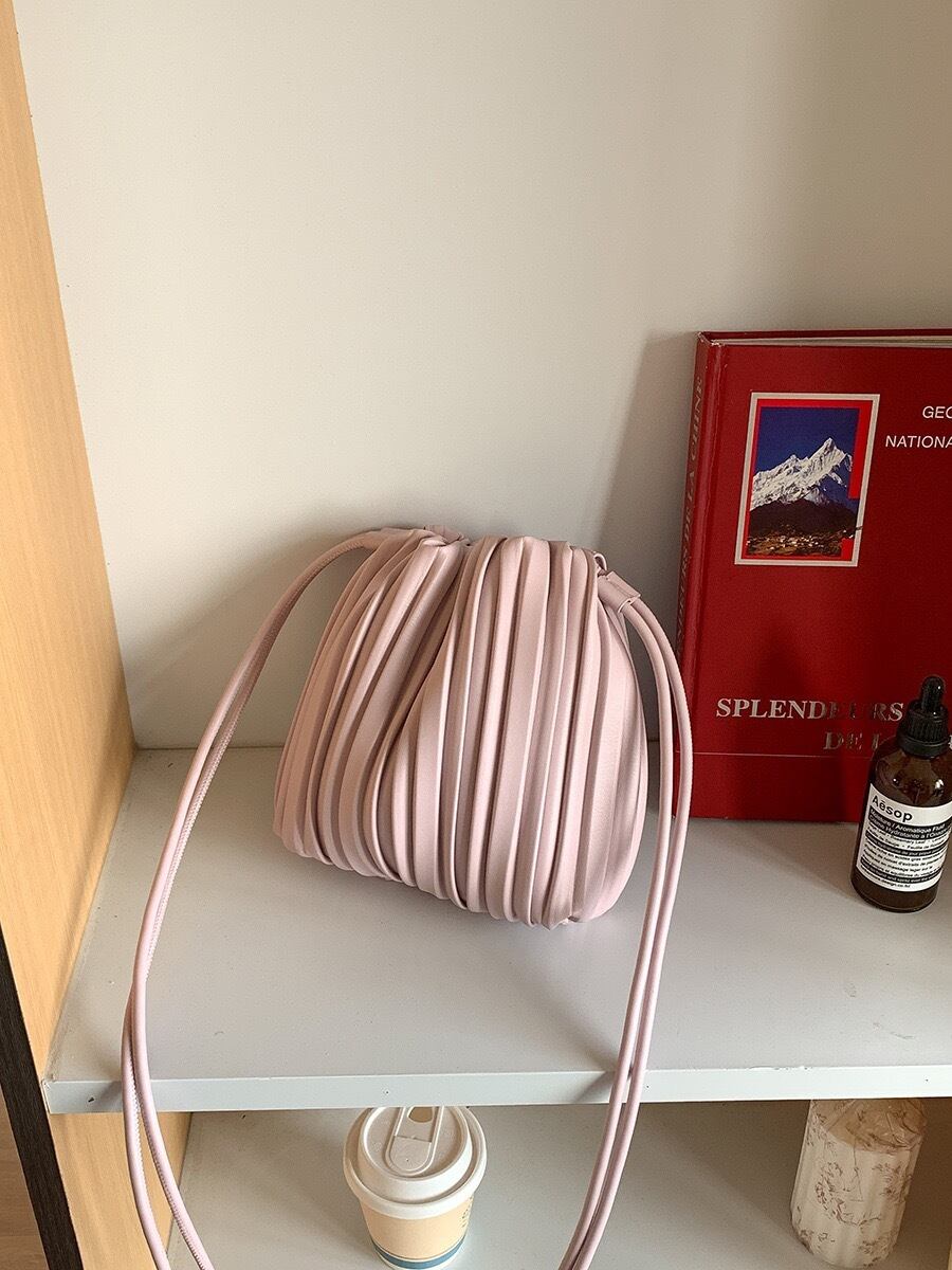 合皮素材をプリーツ加工した、モダンなデザインが魅力的なショルダーバッグ。