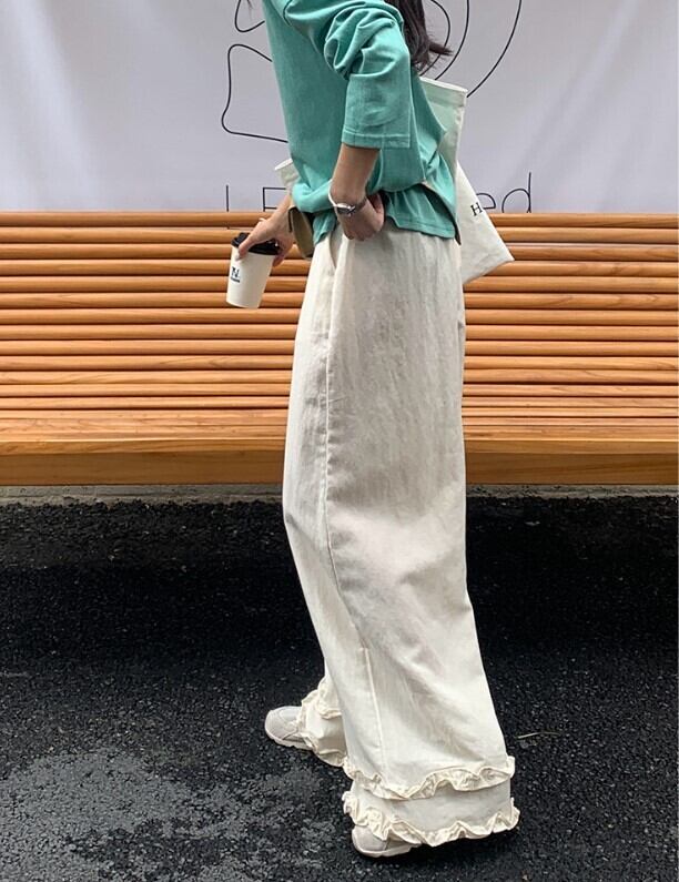 ゆったりワイドフリル付きカラーパンツ。