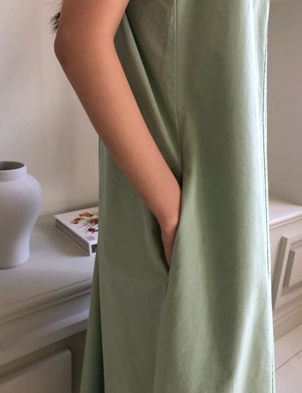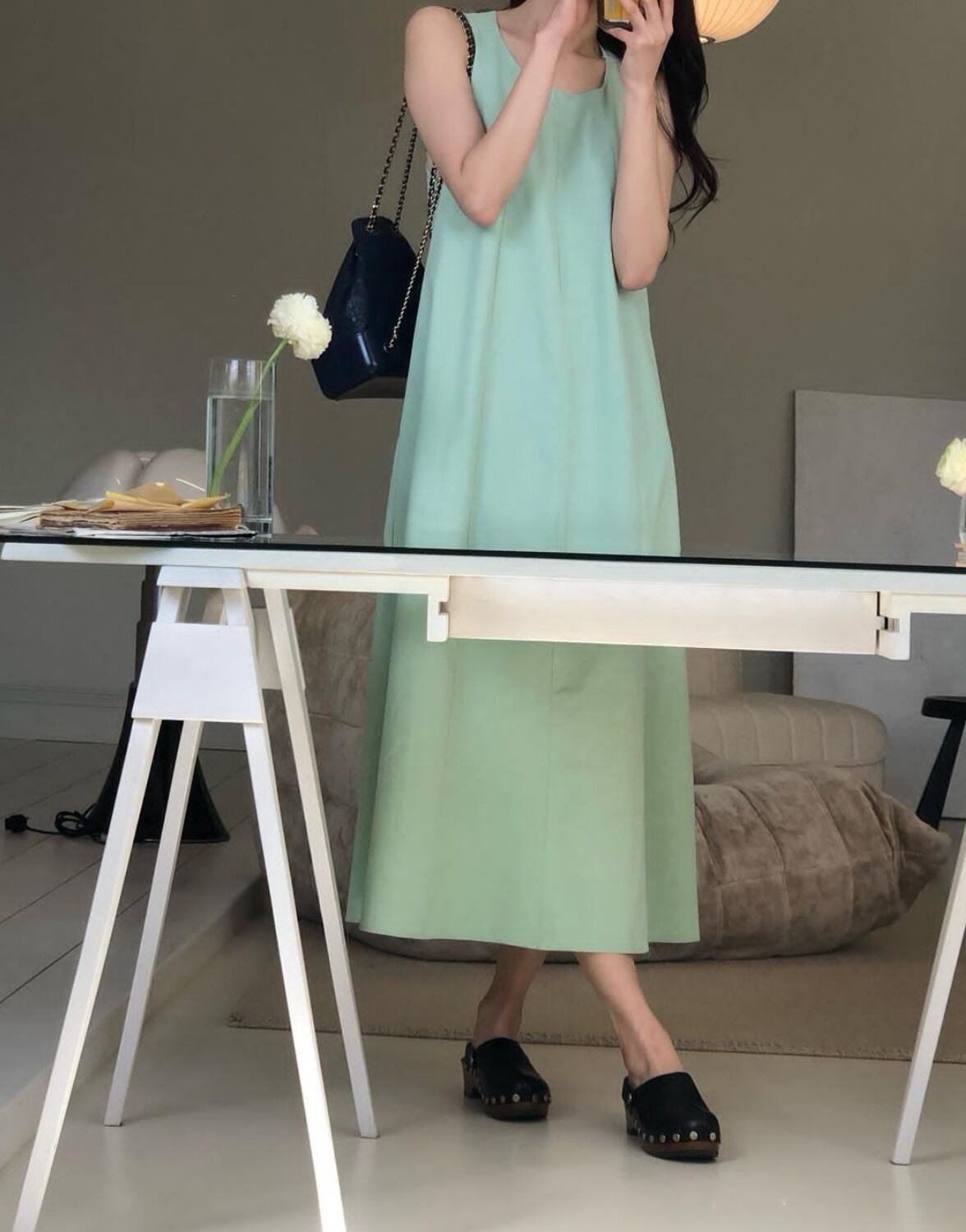 大人カジュアルな表情に仕上げたタンクトップワンピース。
