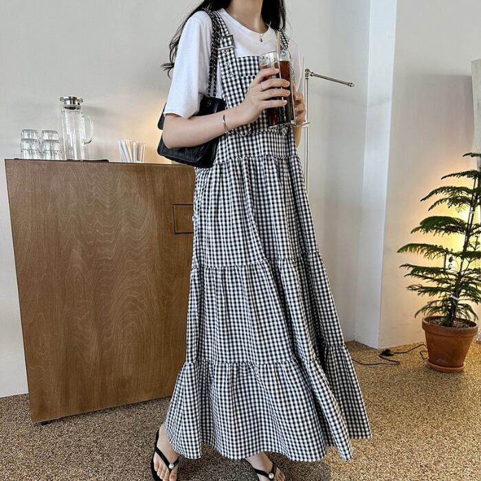 レトロ可愛いギンガムチェックとティアードデザインが魅力のジャンパースカート。