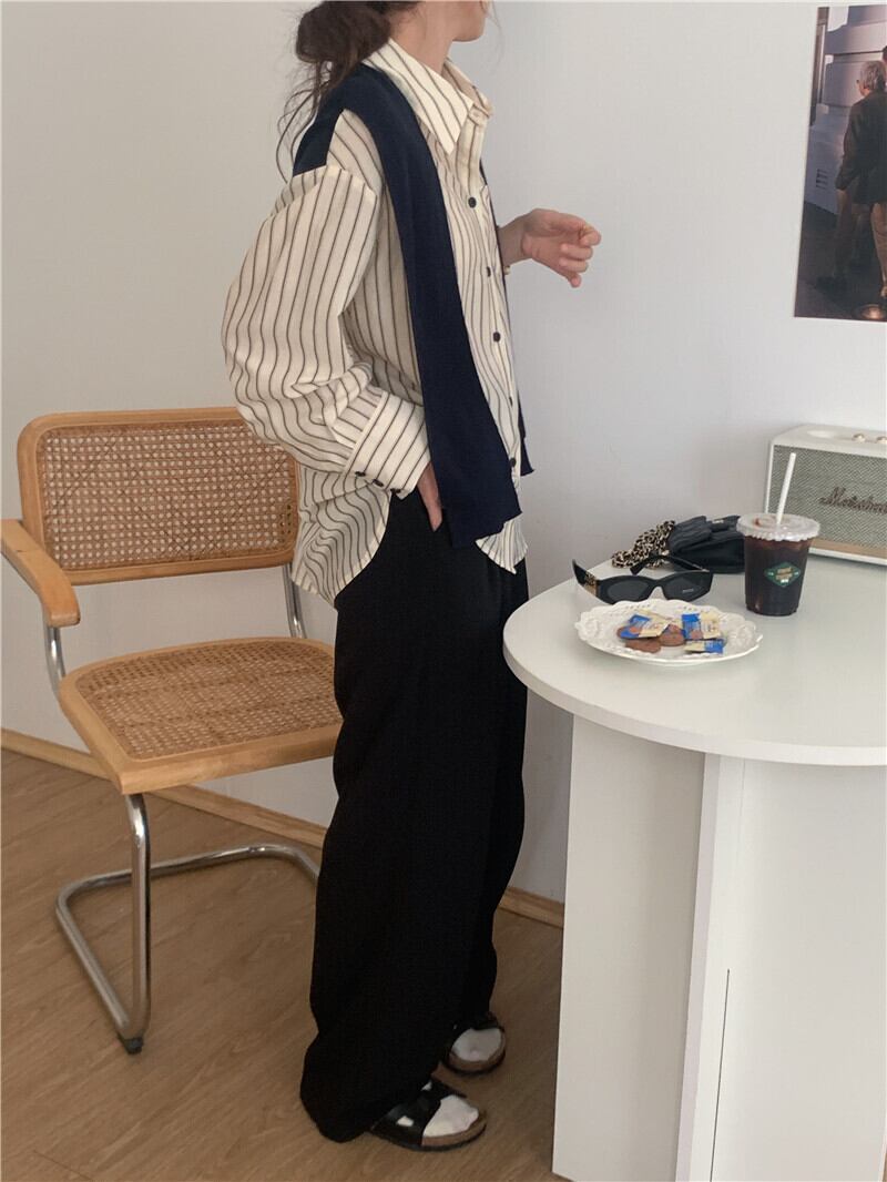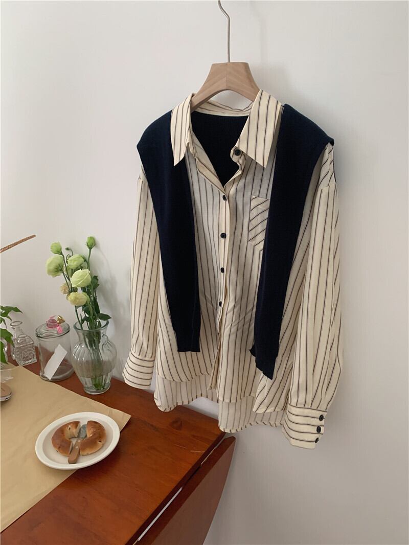 カーディガンを肩かけしたようなデザインのストライプシャツ。