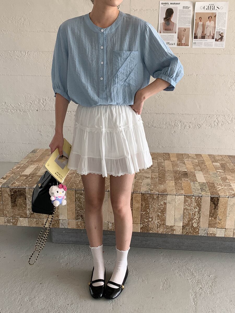 さりげないディテールながら大人可愛いを詰め込んだ品の良いノーカラーブラウス。