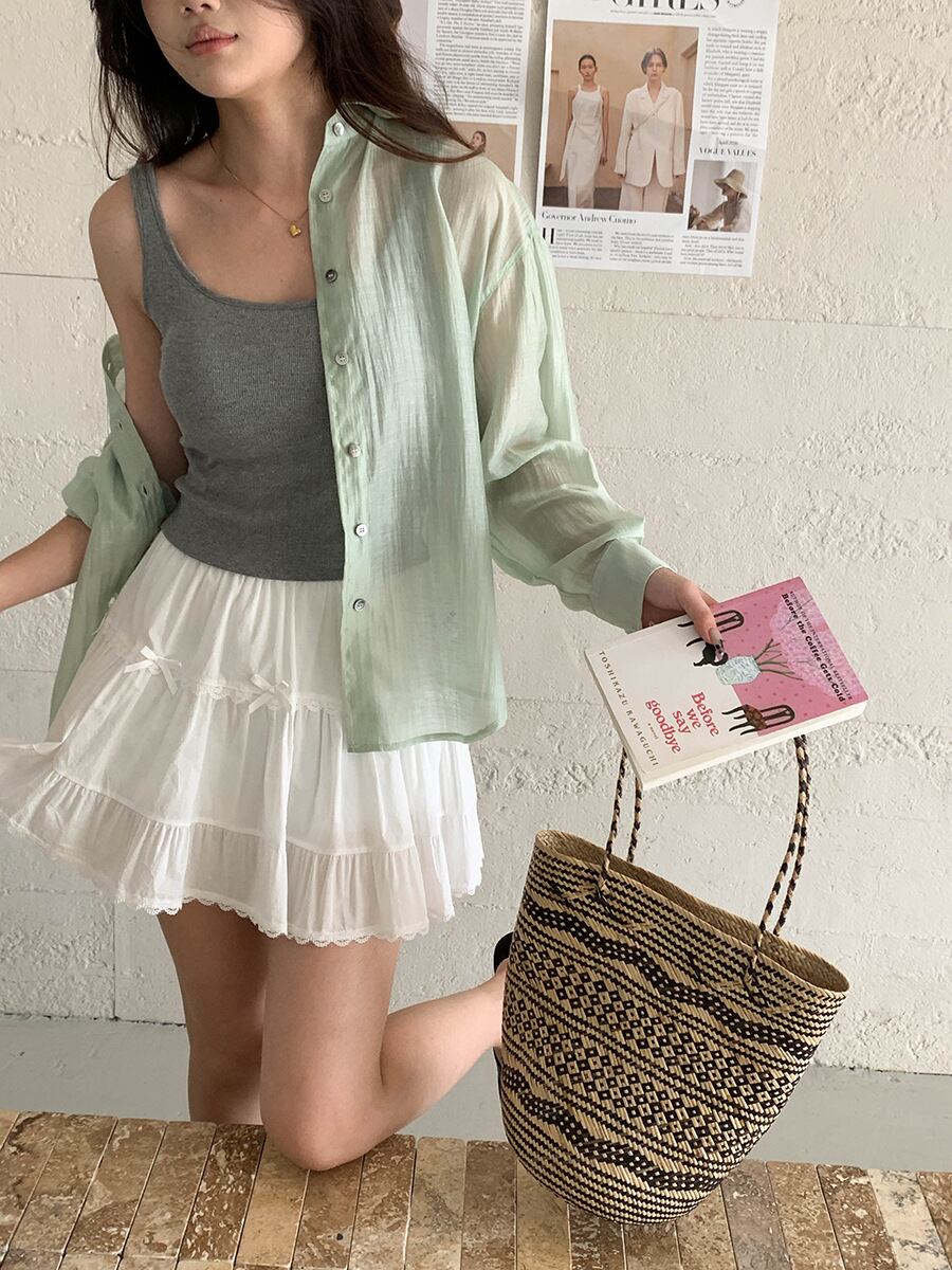 インナーにはキャミやタンクトップ、肌見せを控えたい場合はTシャツやカットソーを!