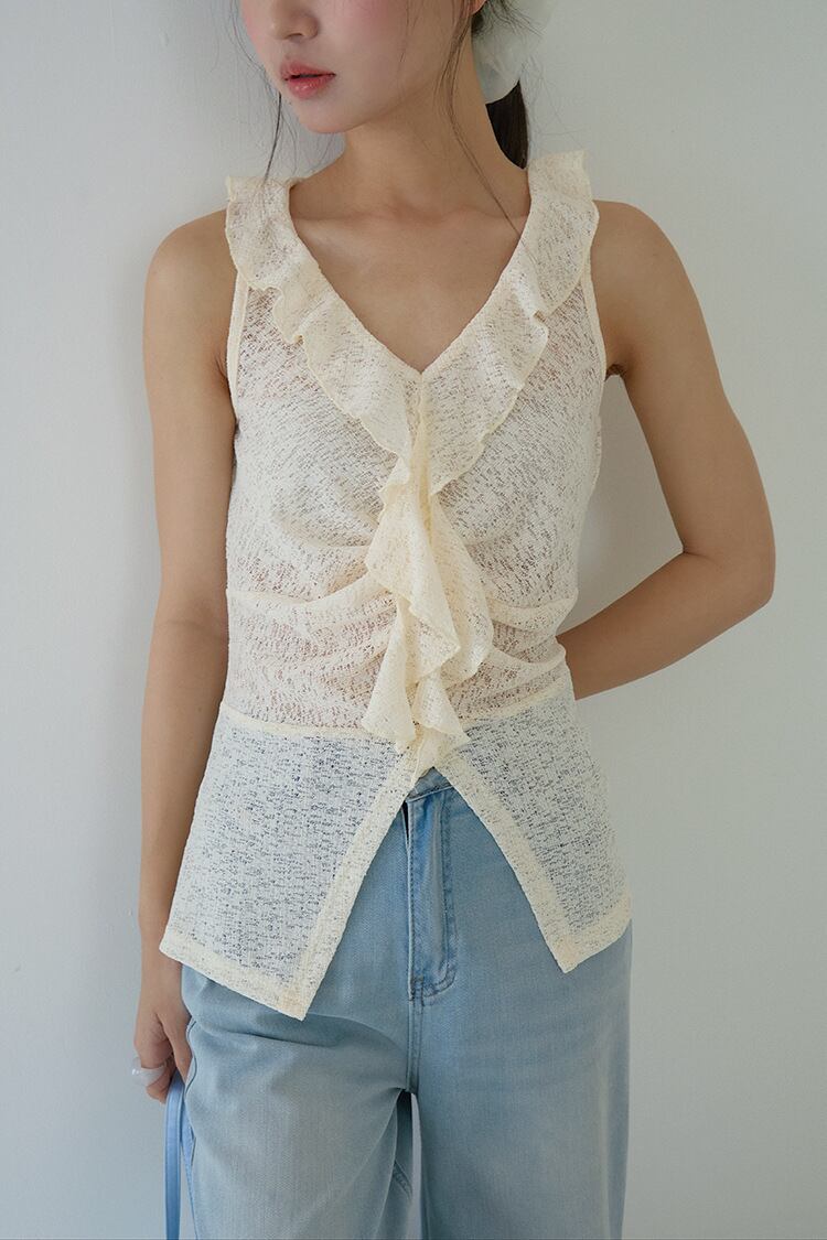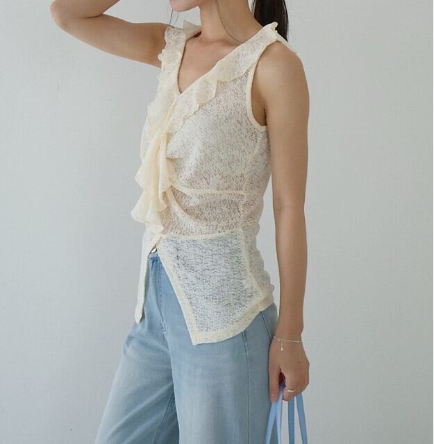 たっぷりのフリルを寄せた1枚でデザイン性のあるノースリーブトップス。