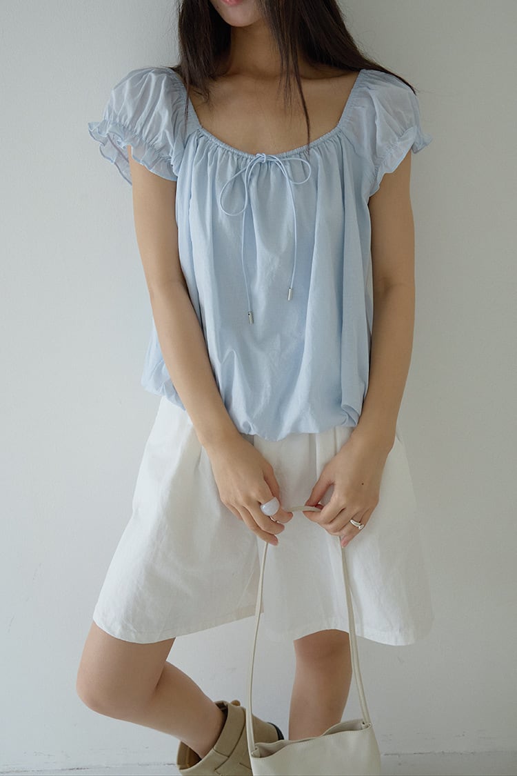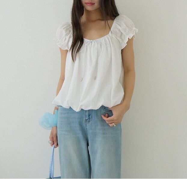トレンドの大きめなパフスリーブで二の腕ラインの華奢みえ効果も期待できるブラウス。