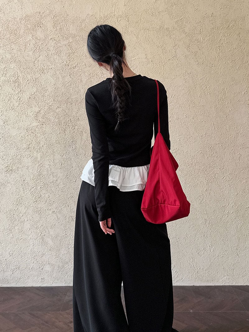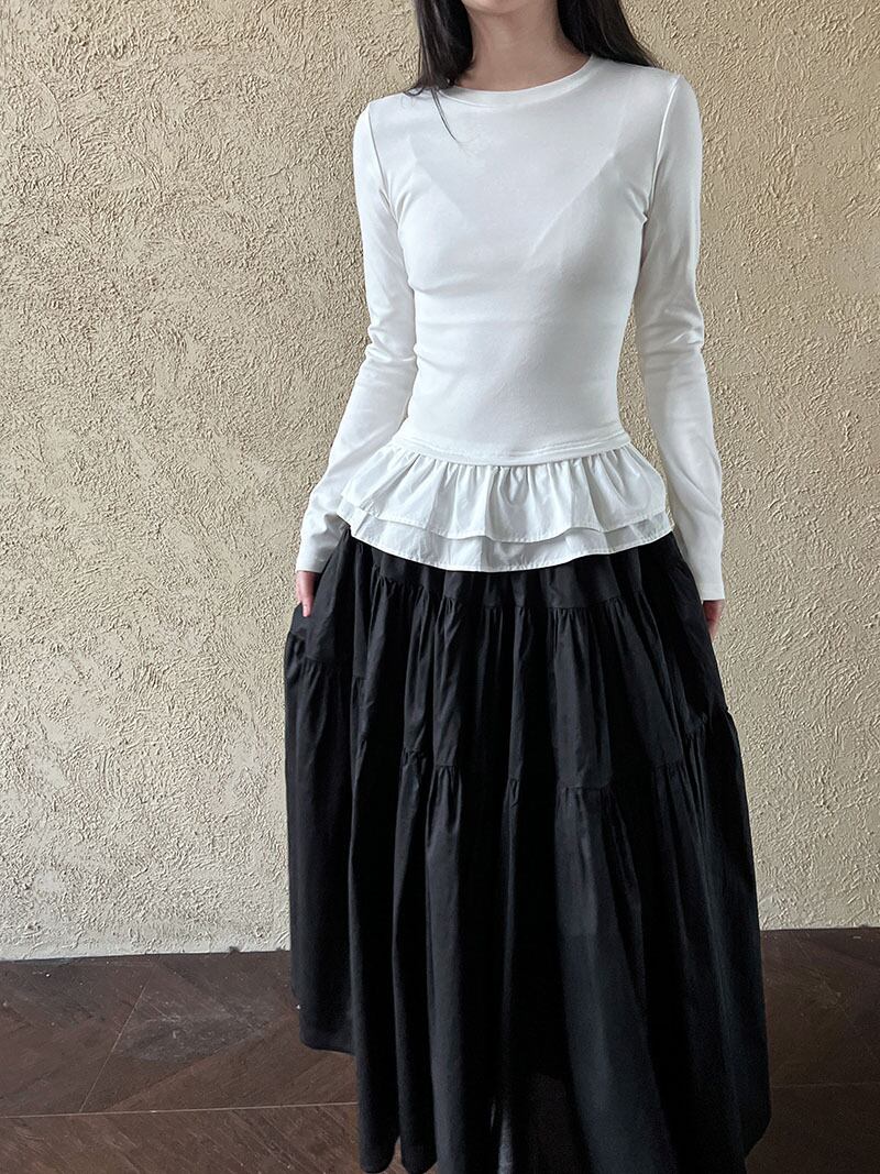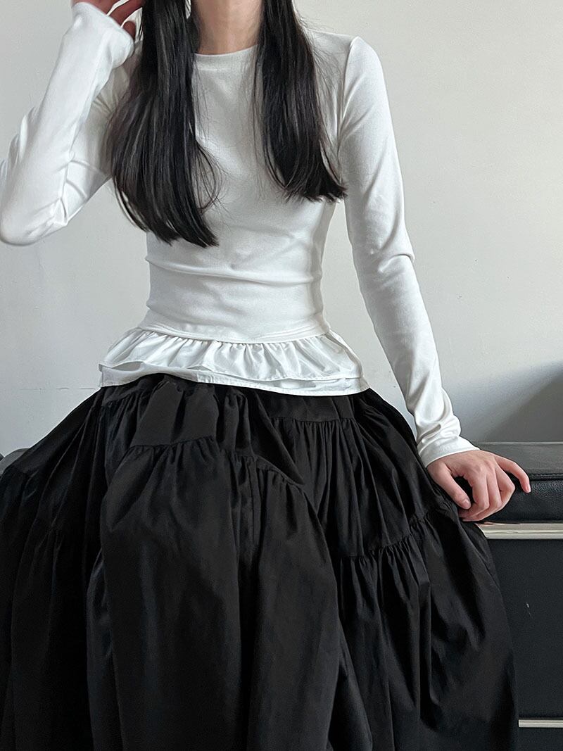 異素材のドッキングしたフリルのようなトップスが付いた存在感あるトップスです♪