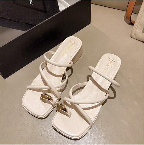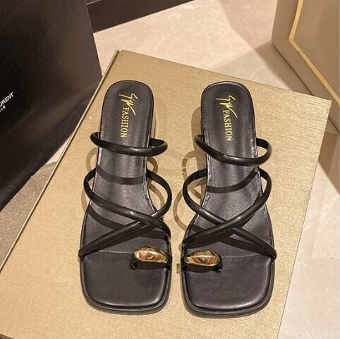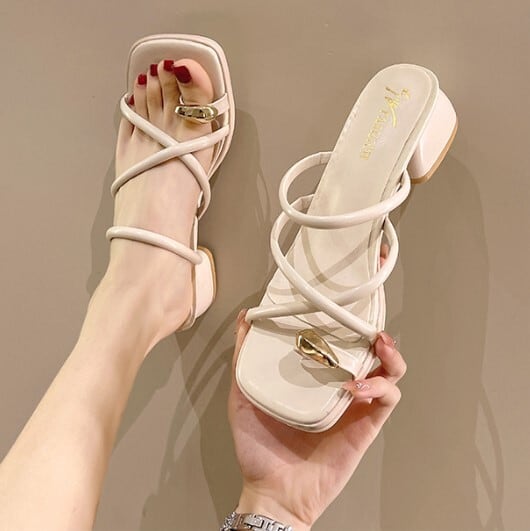 細めストラップがスタイリングのアクセントになっているサンダル。