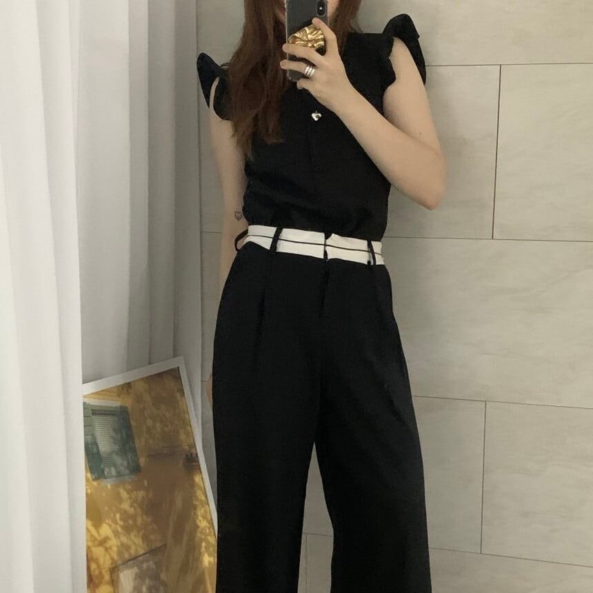 シーズンムード高まる涼しくて薄い素材のブラウスとパンツのセットアップ。