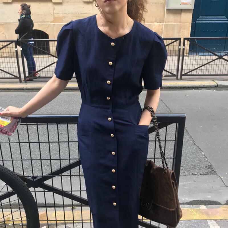 ゴールドボタンがアクセントのシャツロングワンピース。