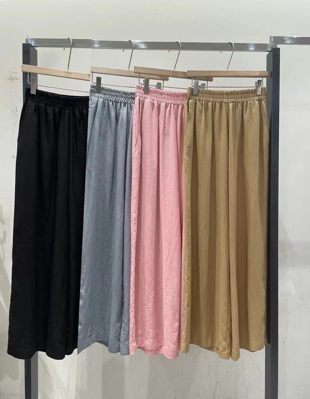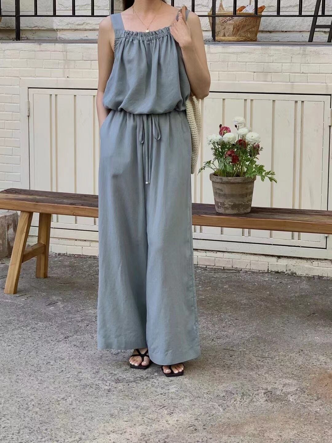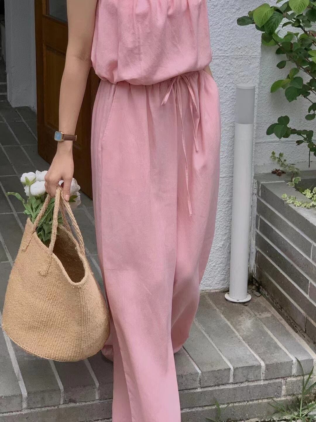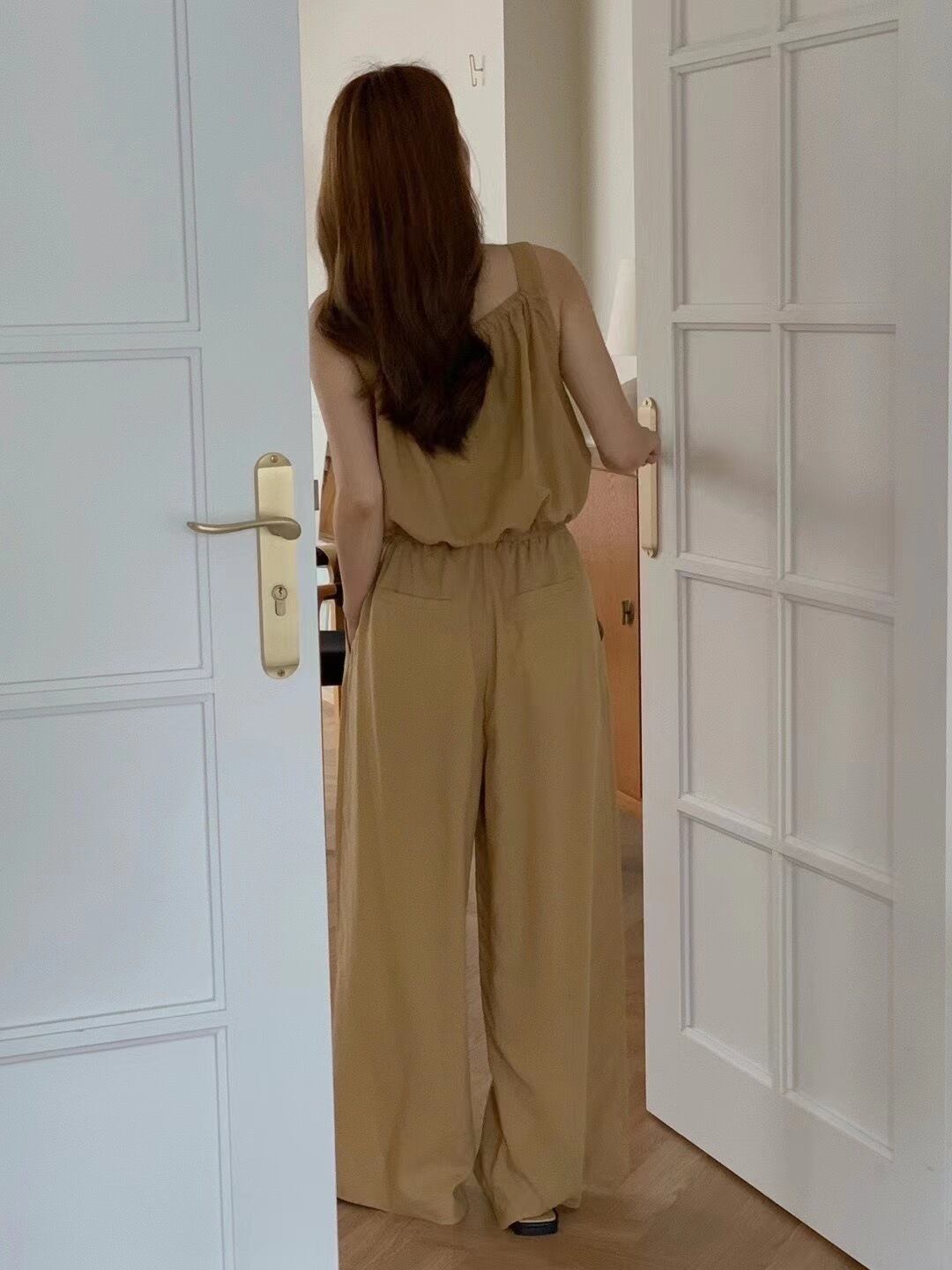 キャミソールとワイドパンツのカジュアルなセットアップ。