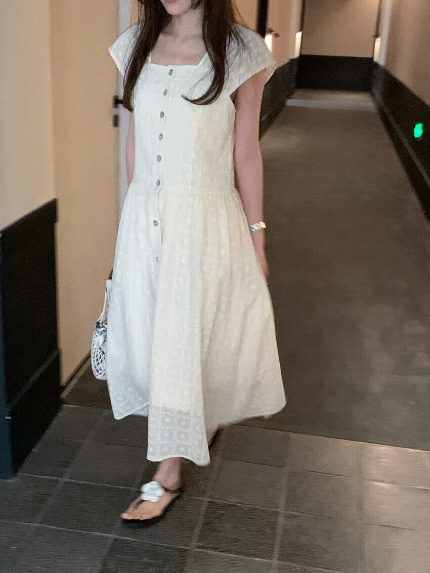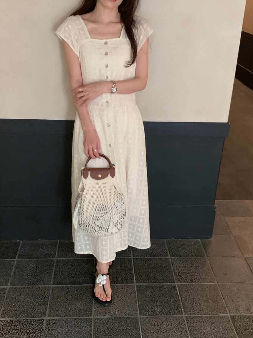 デコルテが映えるスクエアネックデザインが女性らしいデザイン。