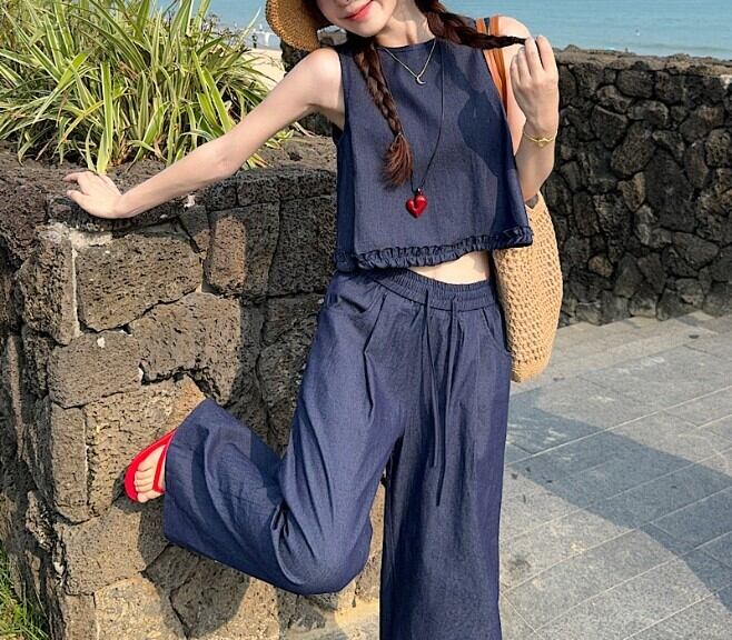 小ぶりなノースリーブトップスにワイドなパンツでメリハリボディに。