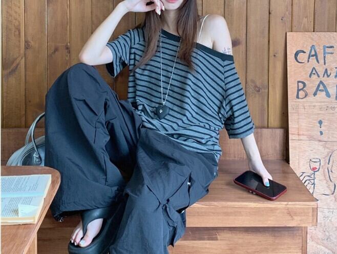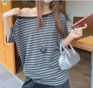 華奢な鎖骨ラインをキレイに見せてくれるオフショルデザインに、細めのボーダー柄がこなれた抜け感をプラス◎