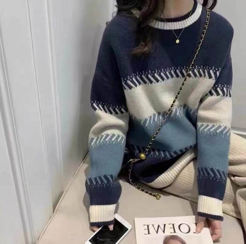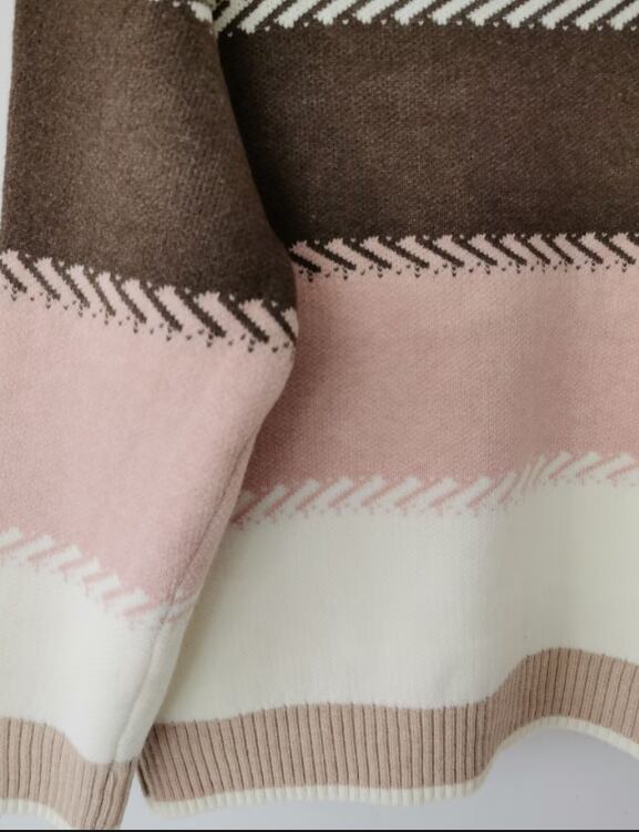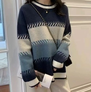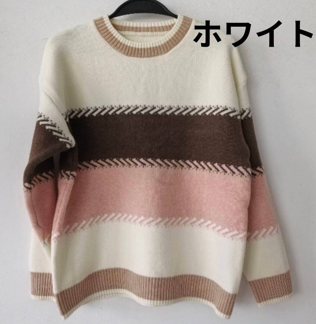 存在感ある配色のボーダー柄が魅力のルーズニットセーター。ドロップショルダーと丈長のデザインで、こなれ感のあるスタイリングを楽しめます。