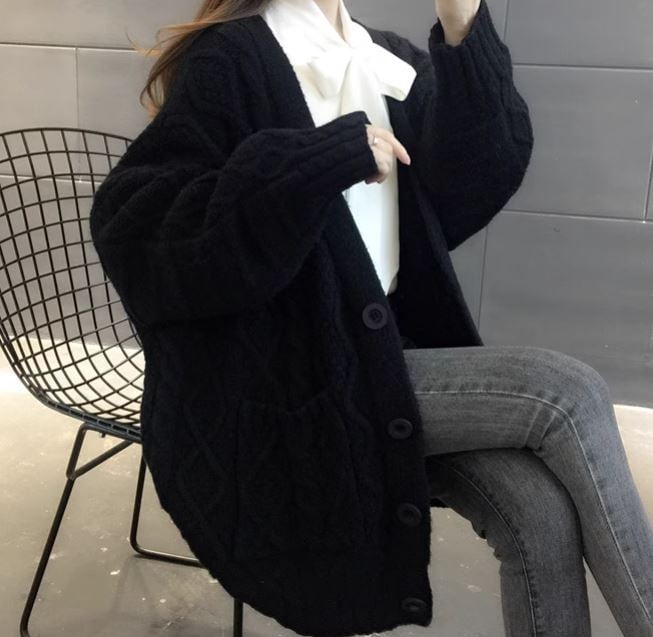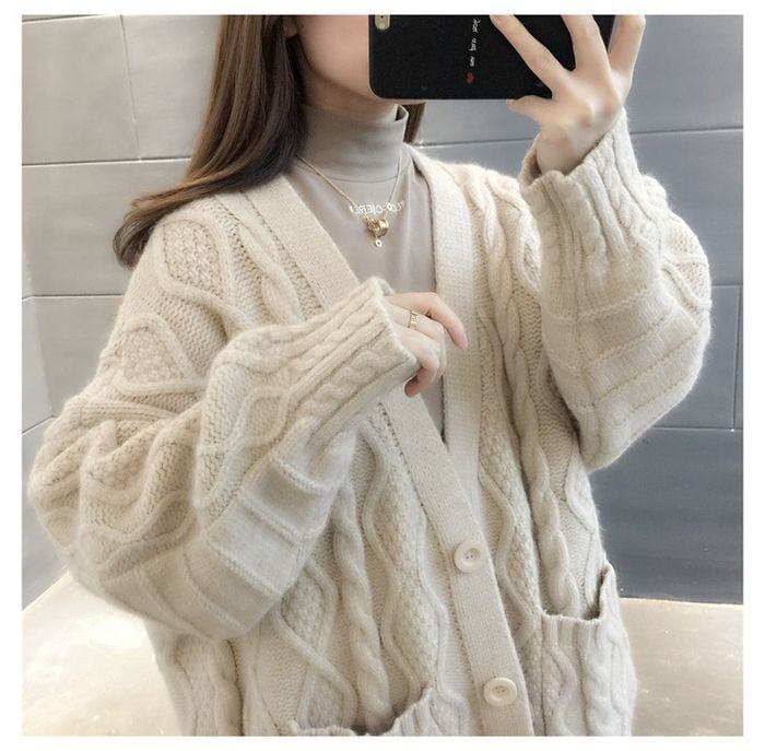 ざっくりとしたケーブル編みが優しい印象のニットカーディガン。