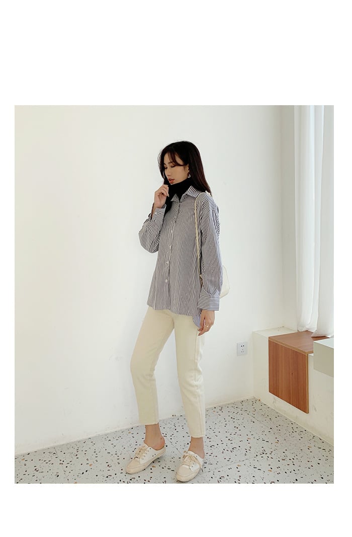 エレガントさとカジュアル感を兼ね備えたストライプ柄のシャツブラウスです。