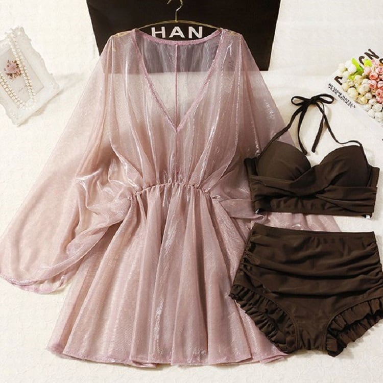 ビキニ水着にシースルーワンピースの付いた3点セット。
