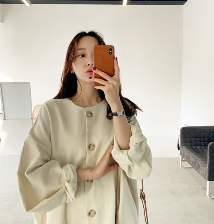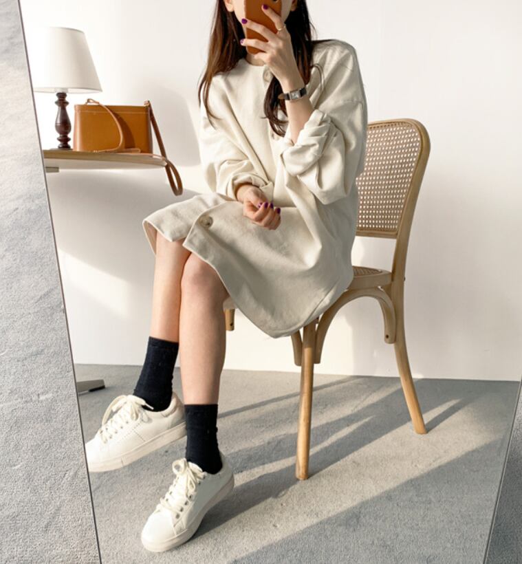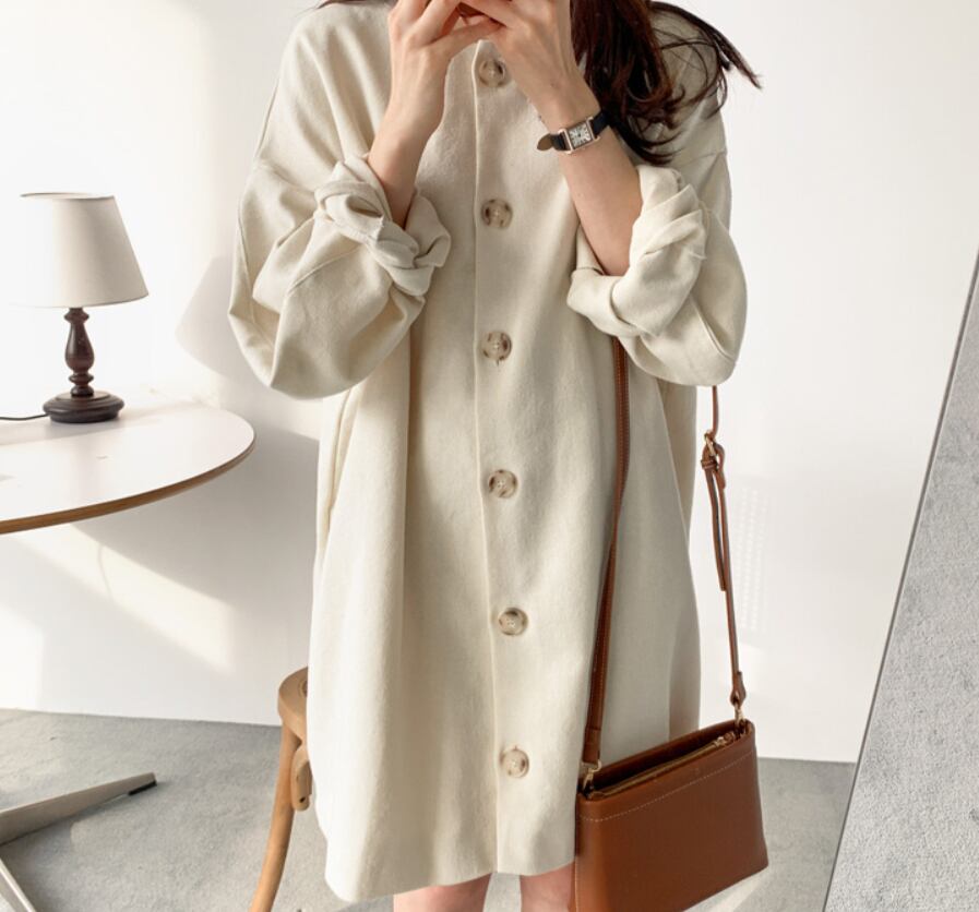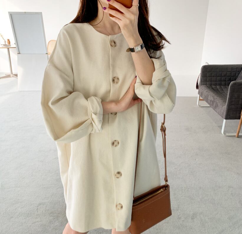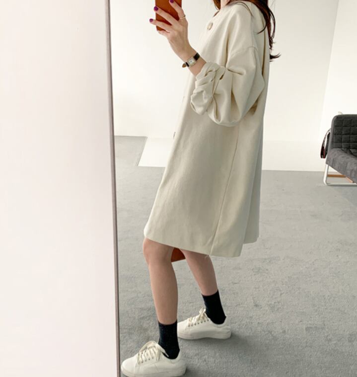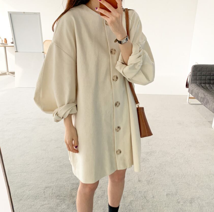 大きなボタンがアクセントのワンピース。