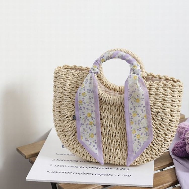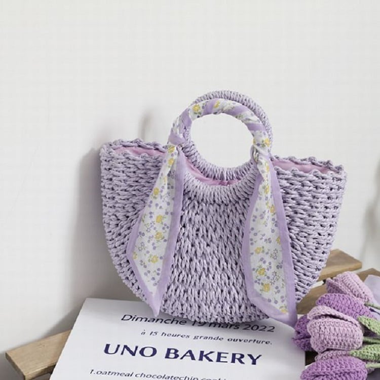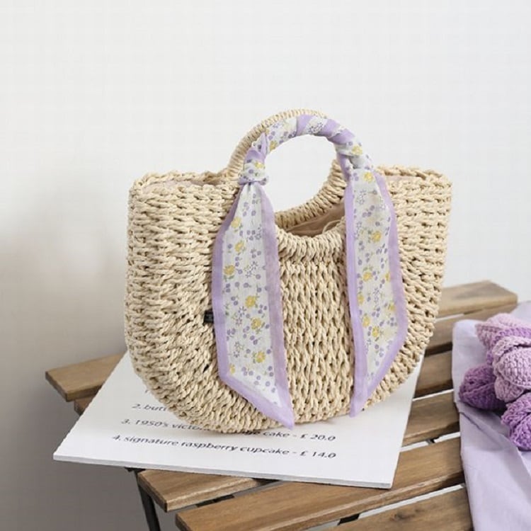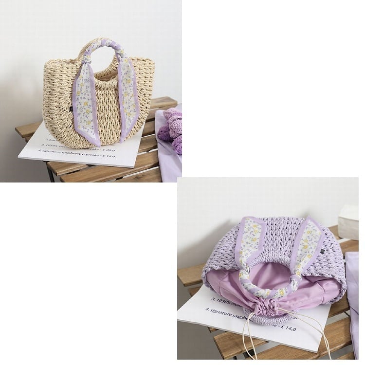 2カラー/ストローバッグ/編みバッグ/小花柄リボン付き/ハンドバッグ/レディース/ナチュラル/パープル
