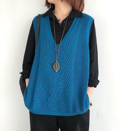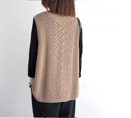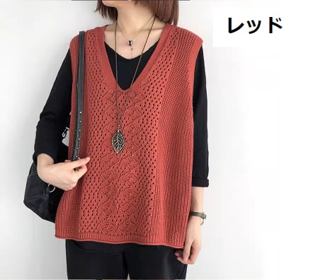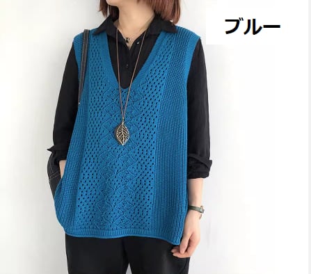 Vネックや透かし編みのディテールが女性らしいアクセント。