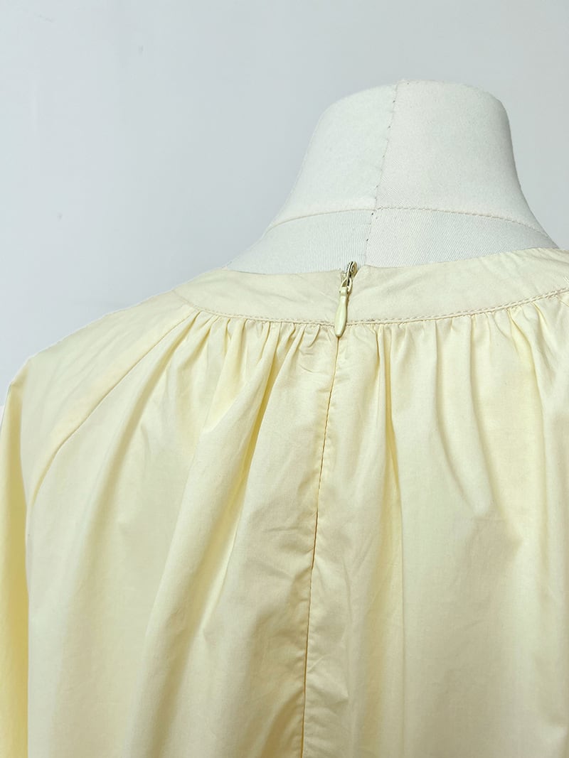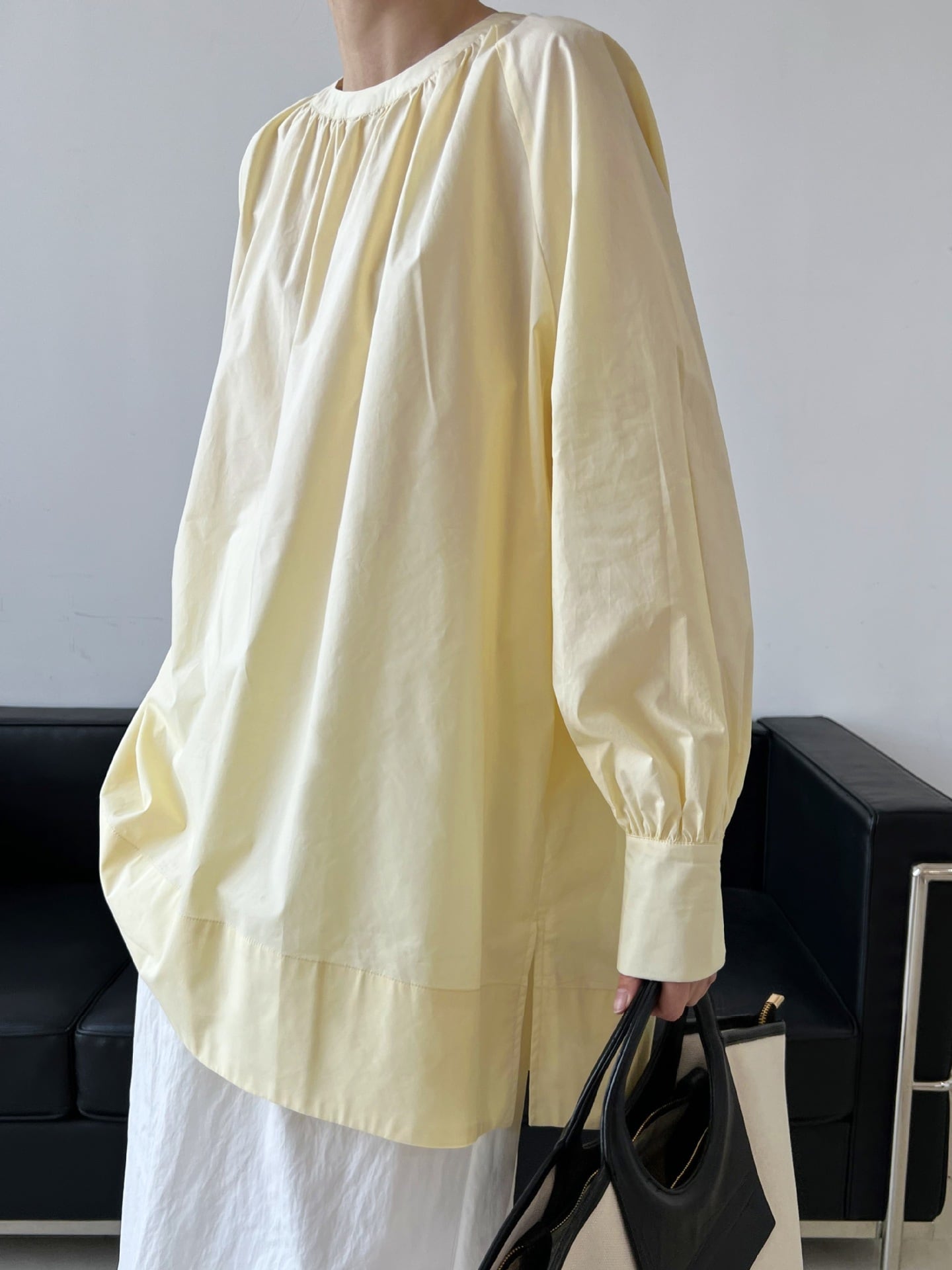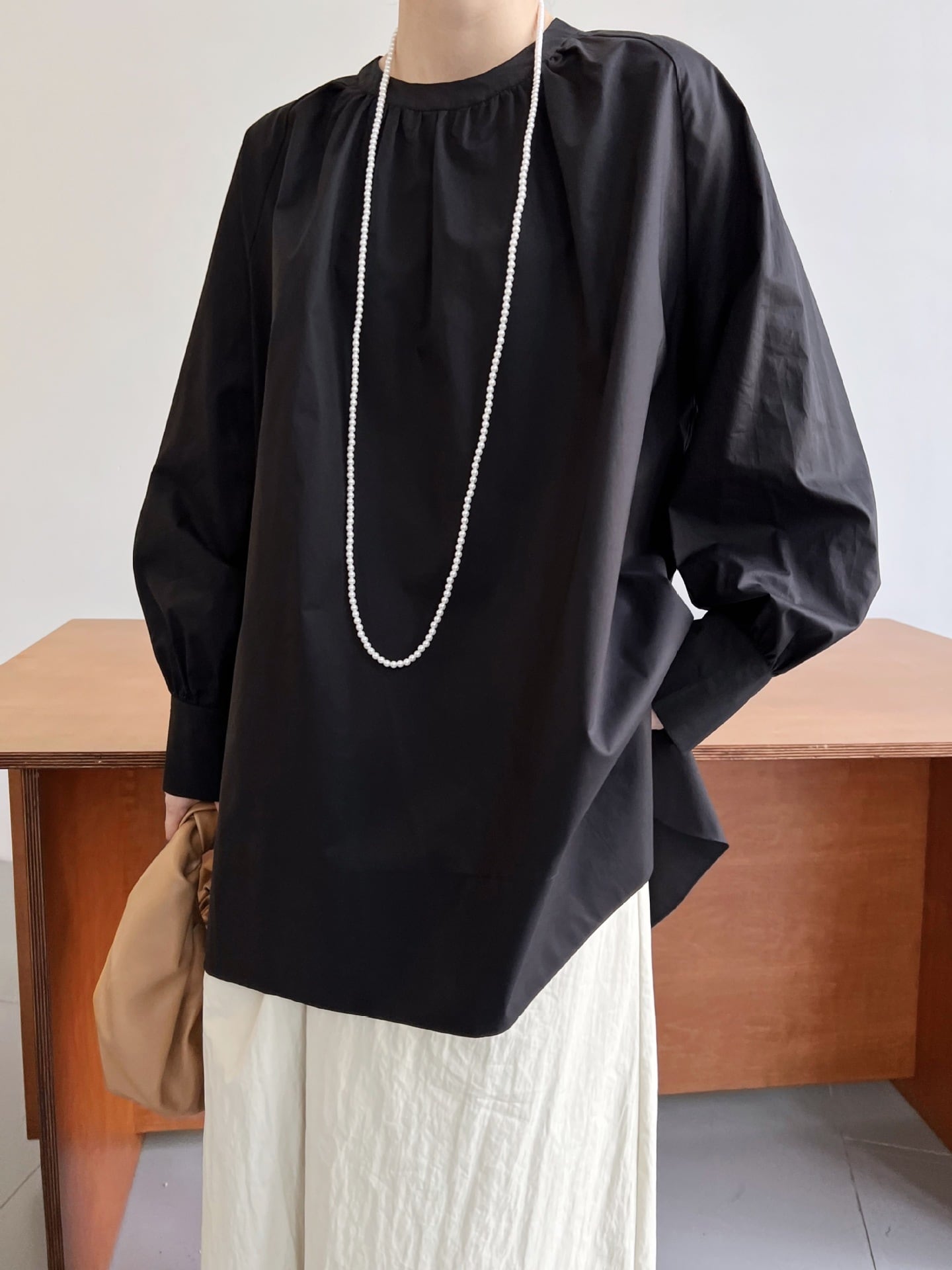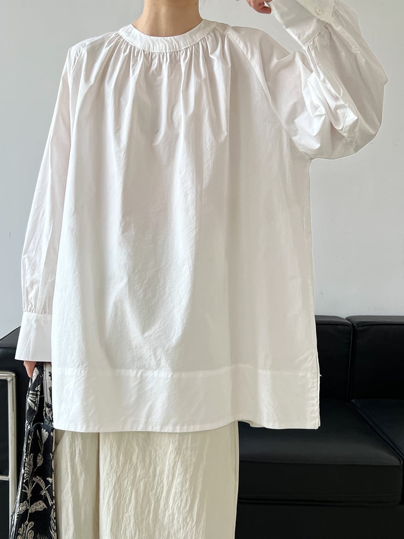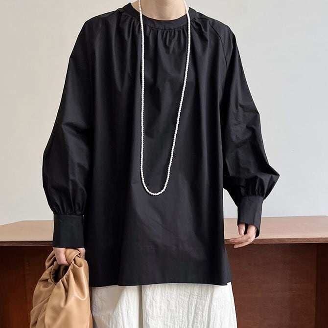 ボリューム袖と裾のワイドなデザインが特徴のブラウス。