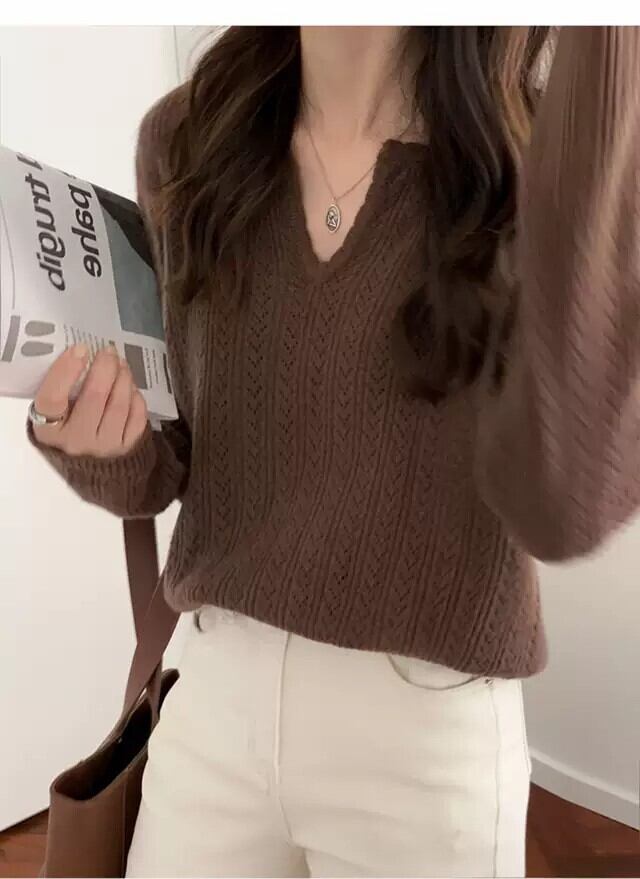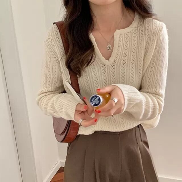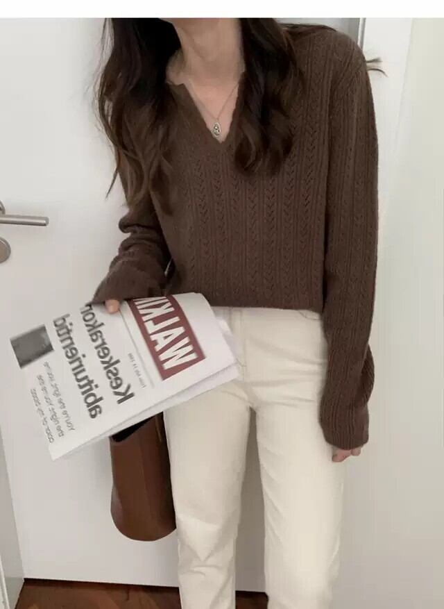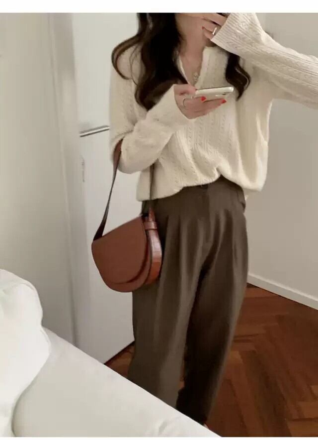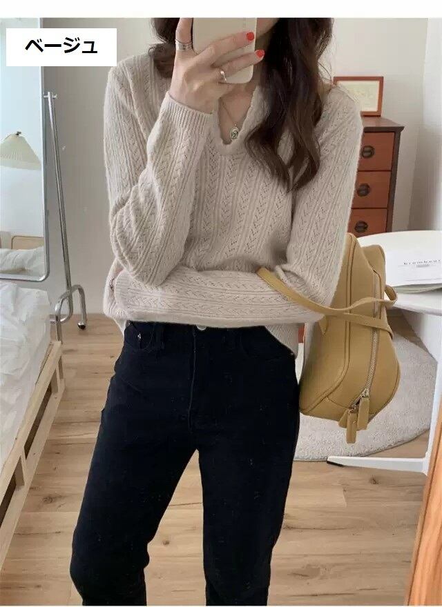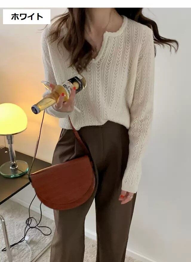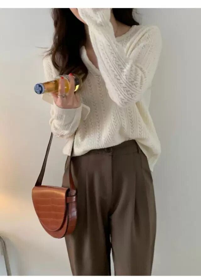 キーネックとストレートなシルエットが女性らしさを引き立て、