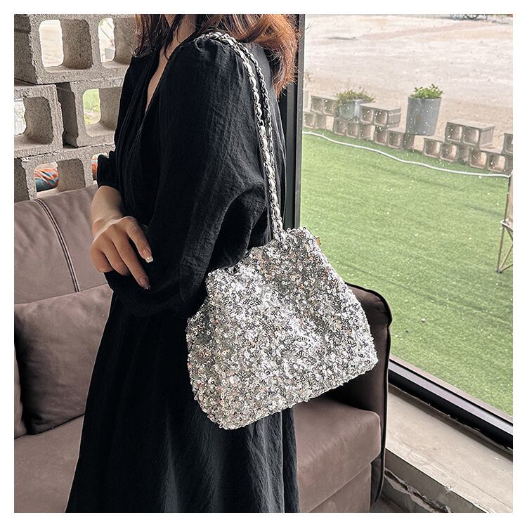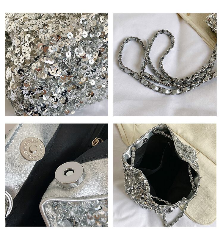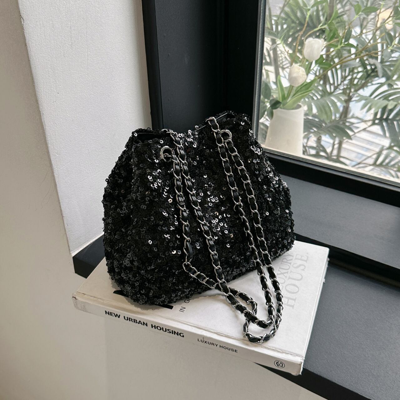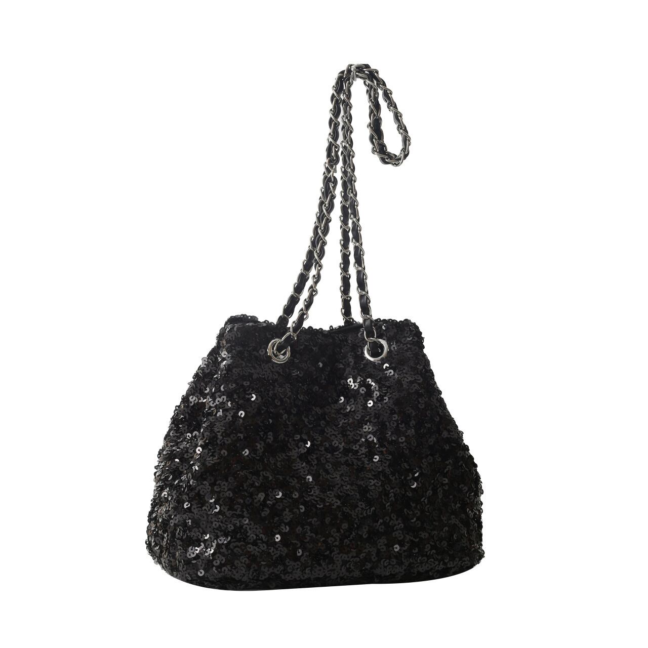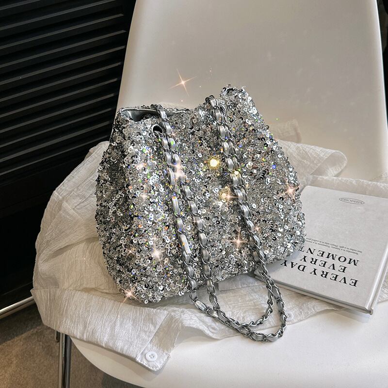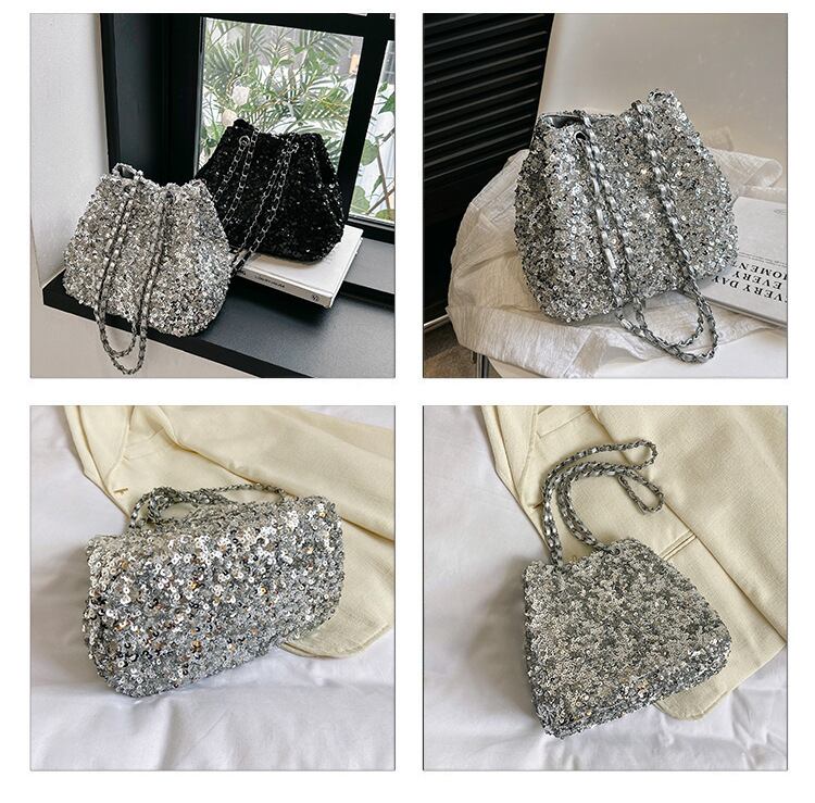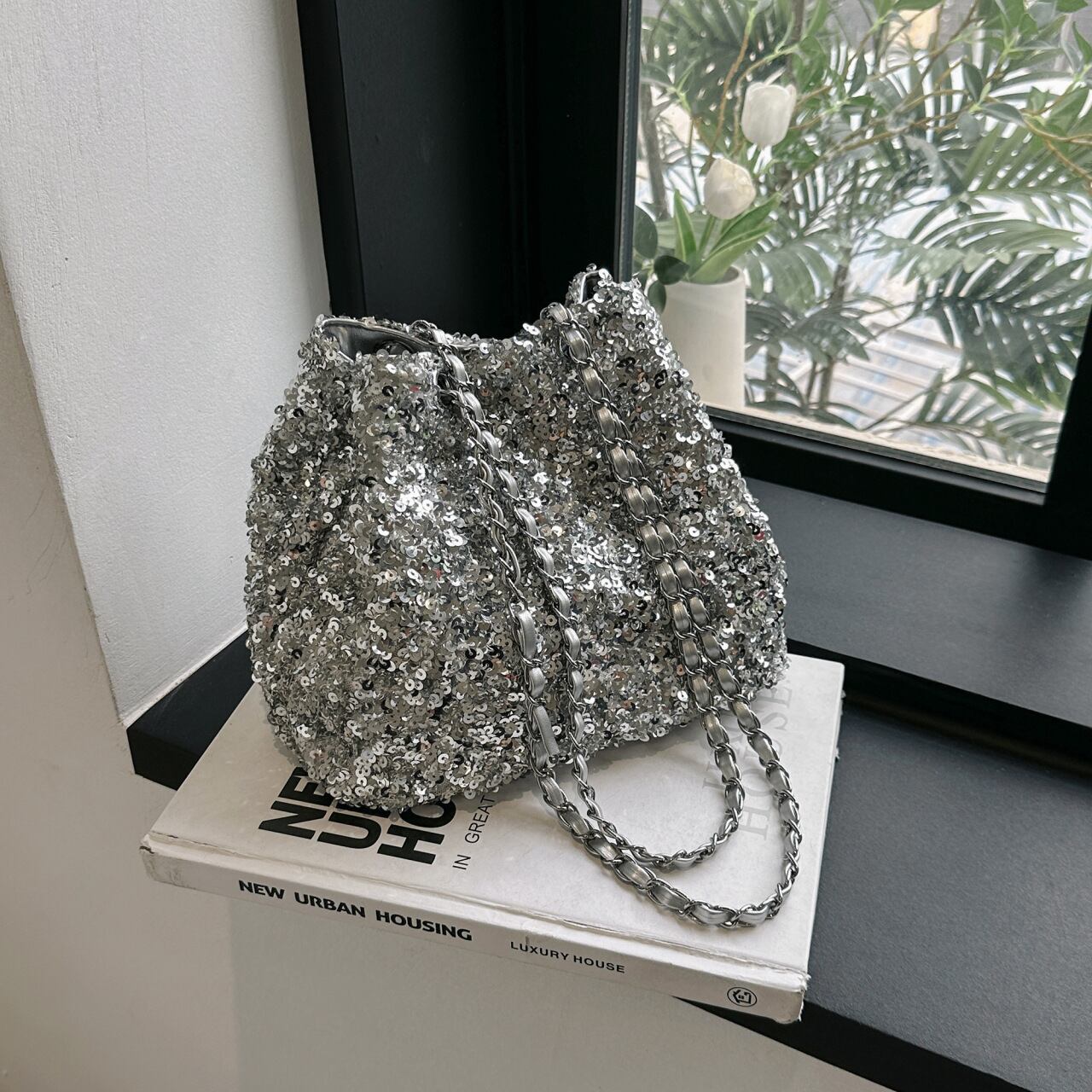 バケツ型のフォルムに、編み込みチェーン、スパンコールなどのディテールが施され、