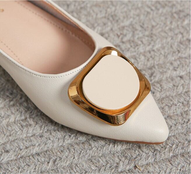 大人っぽい輝きのゴールドのバックルを重ねたモチーフがポイントのパンプス。