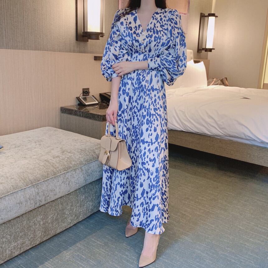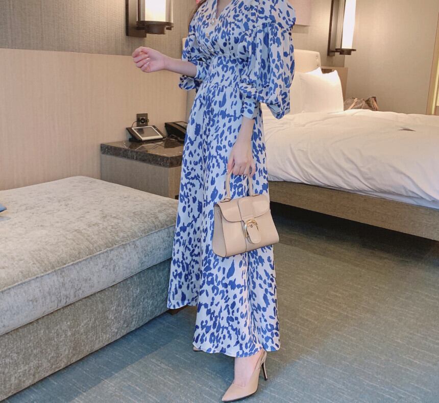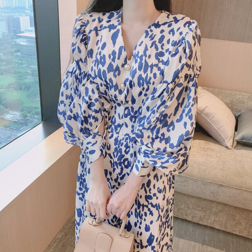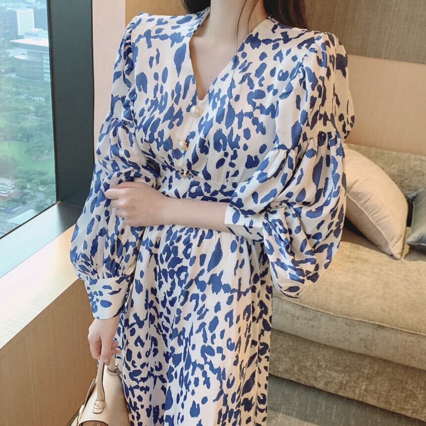 涼しげなブルーでシンプルな柄のランタンスリーブワンピース★