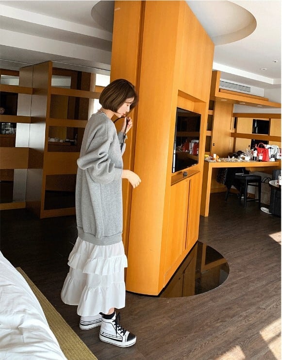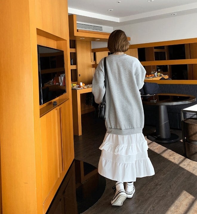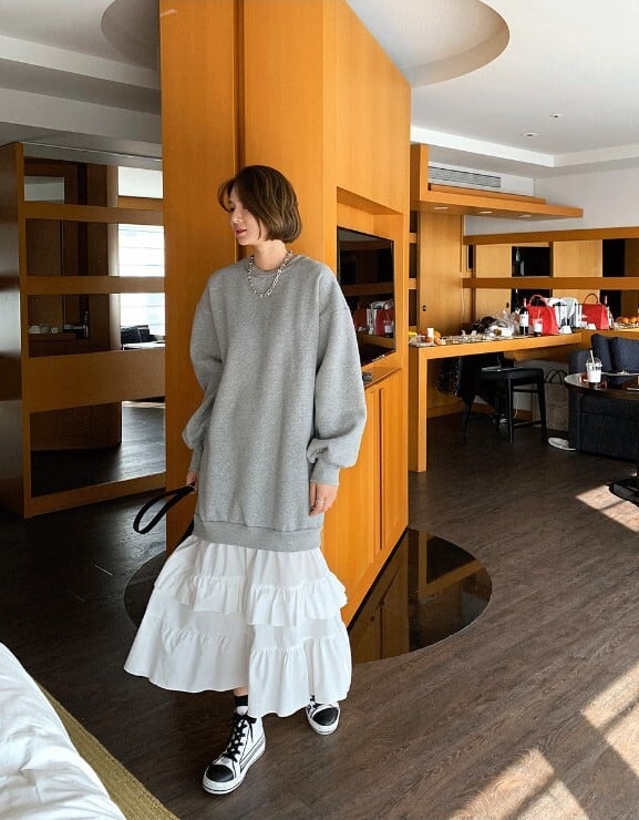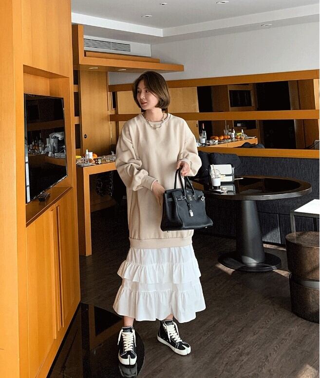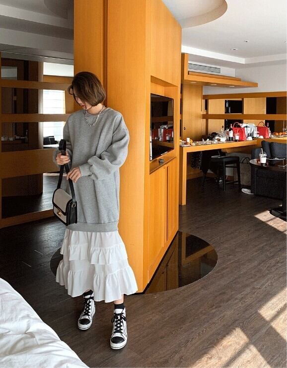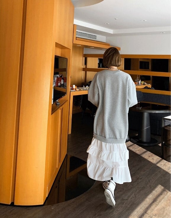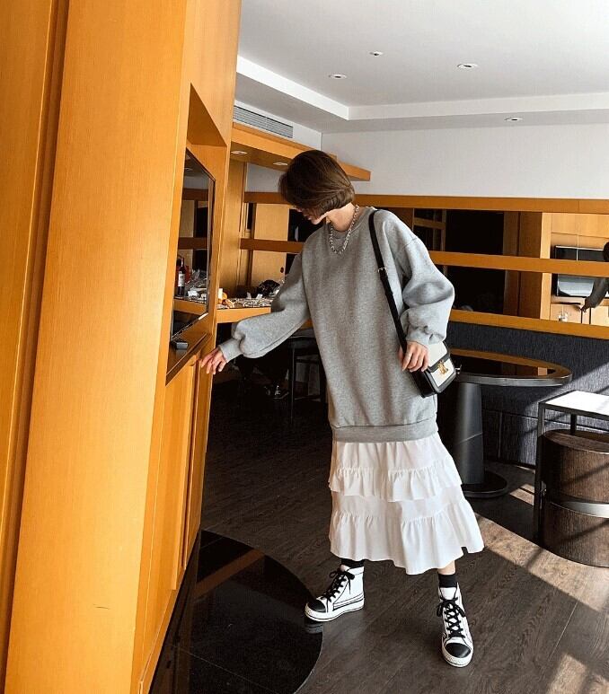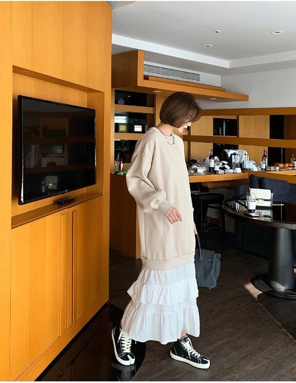 ロングスウェット&シャツ素材のカンカンフリルがドッキングされた異素材ワンピース。