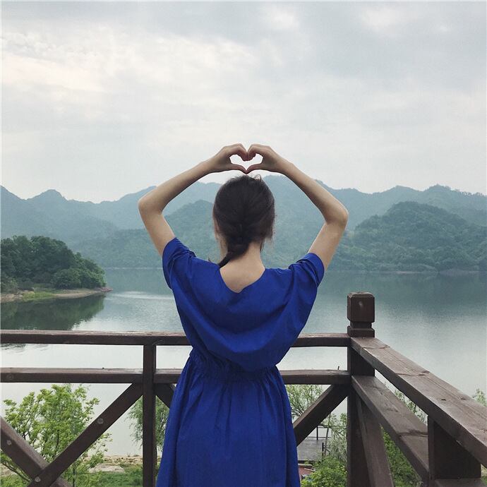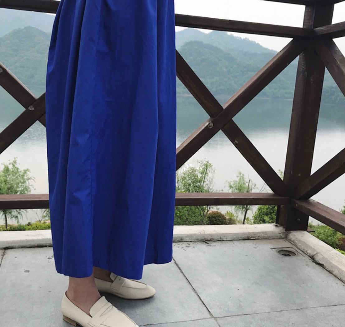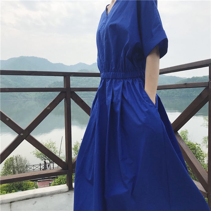 深い青みが目を惹くワンピース。首元の開きから袖の広がりに絶妙の抜け感があります!