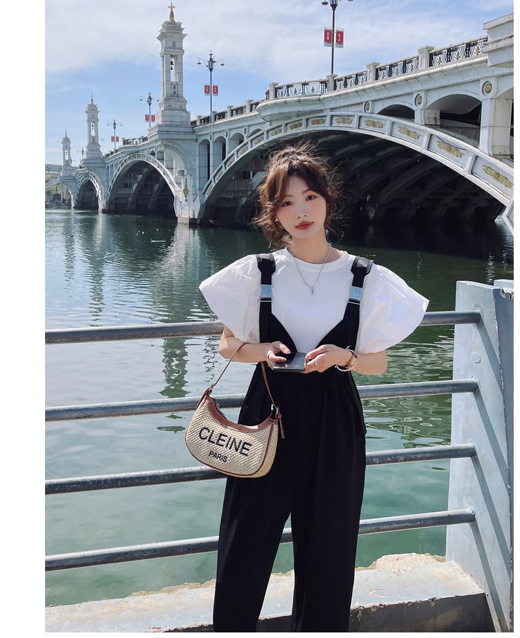 ワイドパンツとバックル付きのショルダーストラップがクールな印象のサロペット。