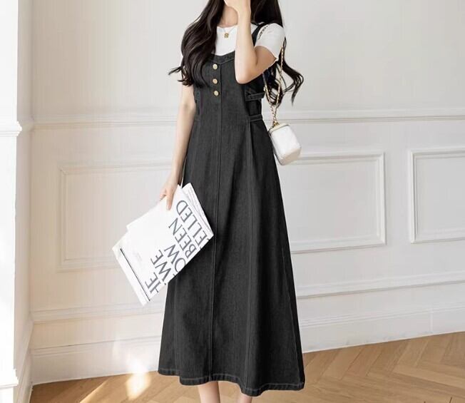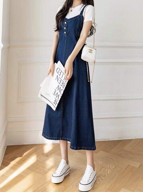 今シーズンのトレンドでもあるデニム素材のジャンパースカート。