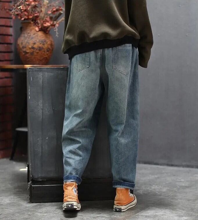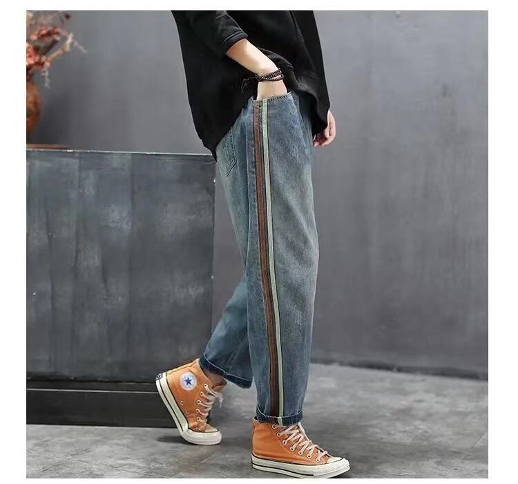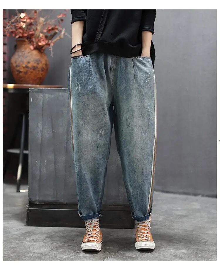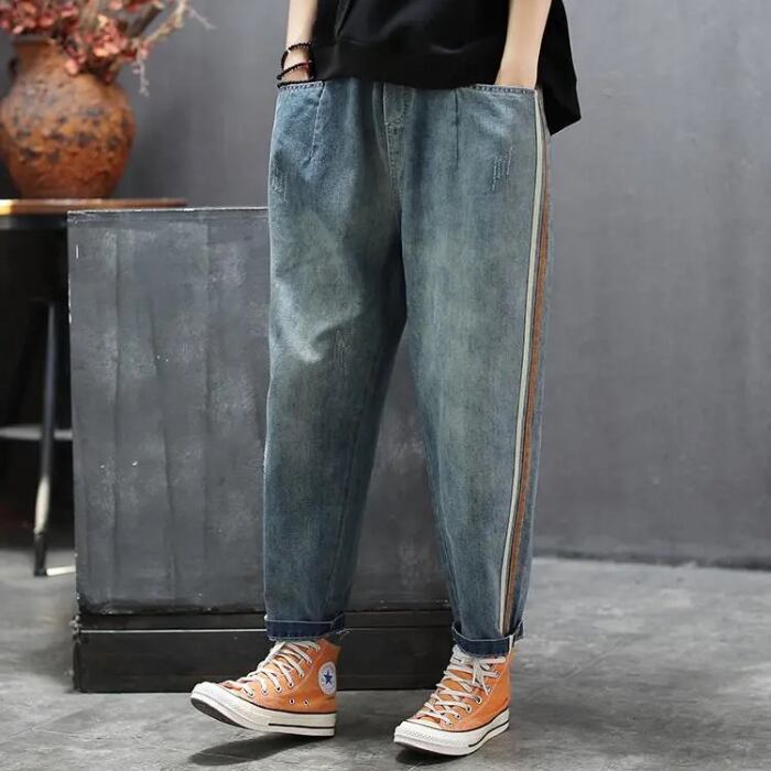 サイドライン入りのデザインが今っぽいサルエルデニム。