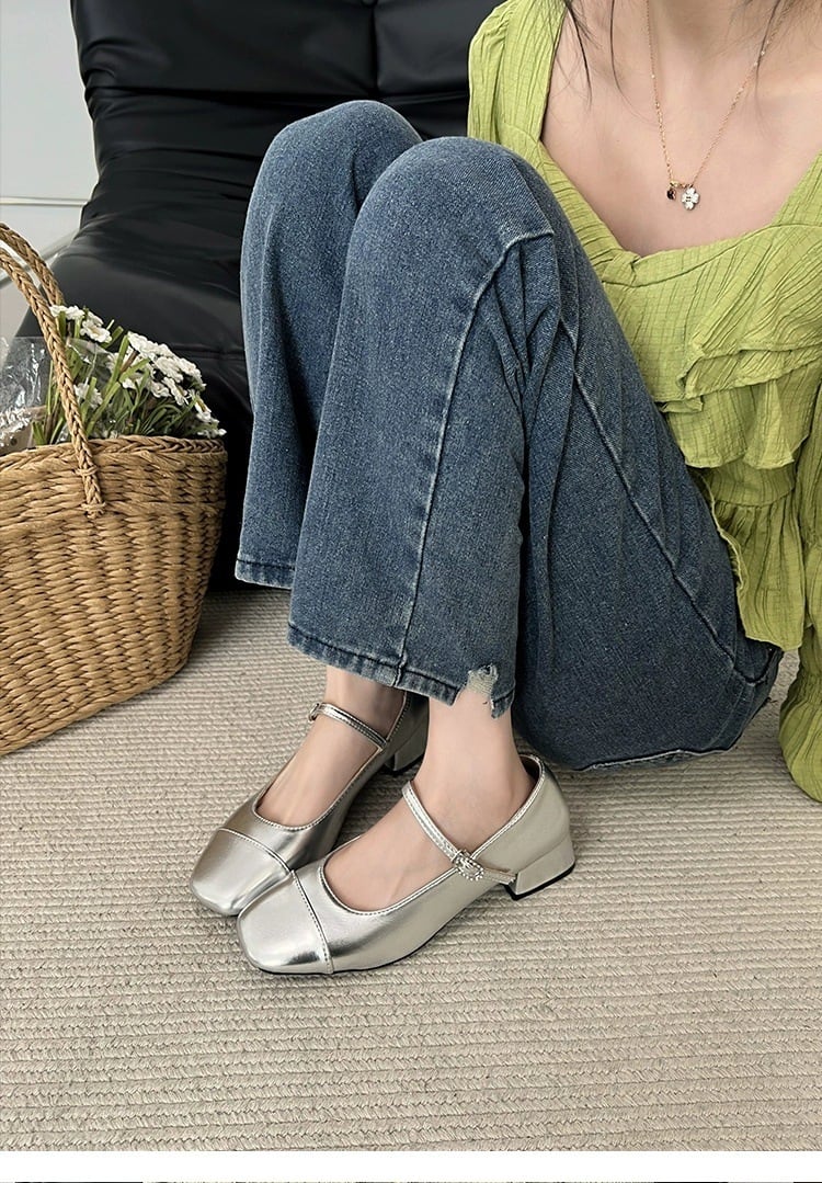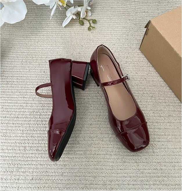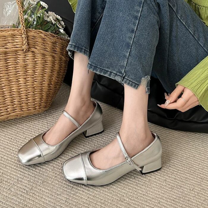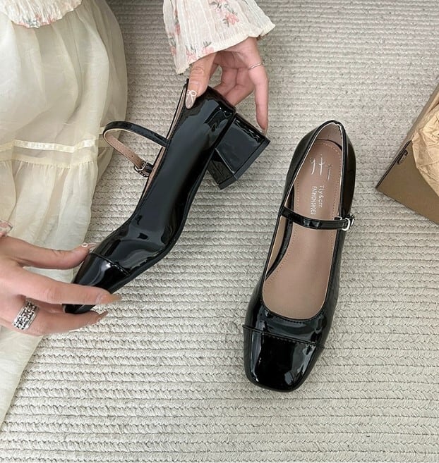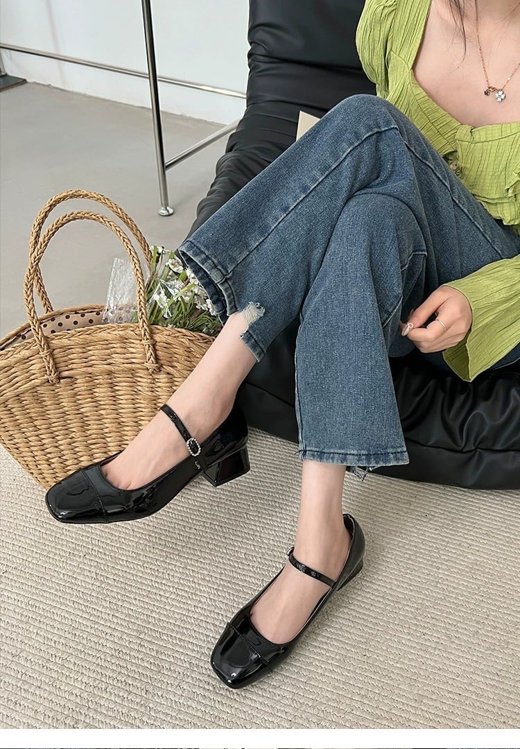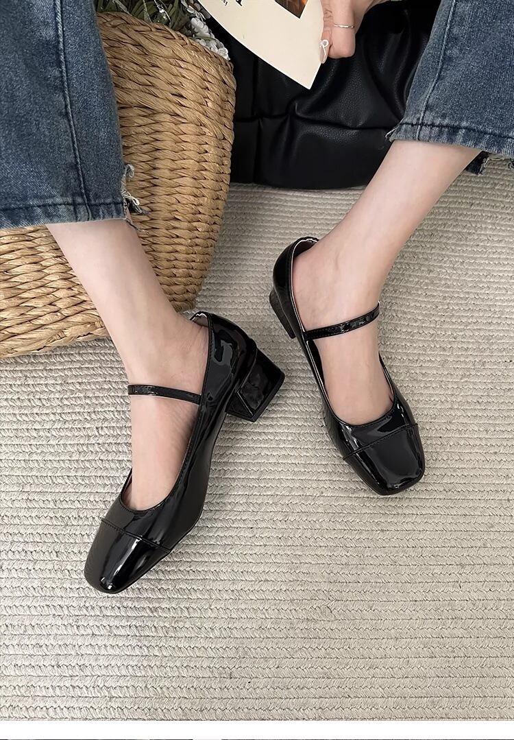 スクエアトゥにつま先の切り替えがレトロムードを高めてくれるストラップパンプス。