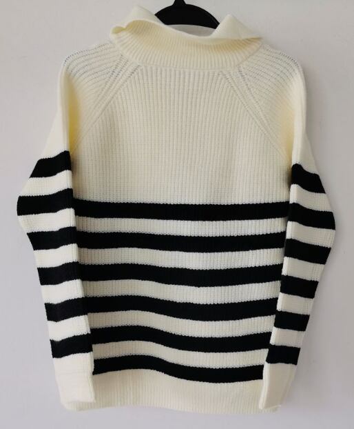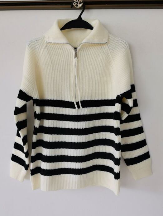 オープンジップの衿が特徴のニットプルオーバー。