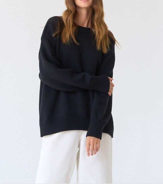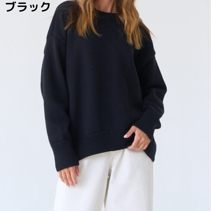 幅広いアレンジを楽しめる、ごくシンプルなデザインのニットプルオーバー。