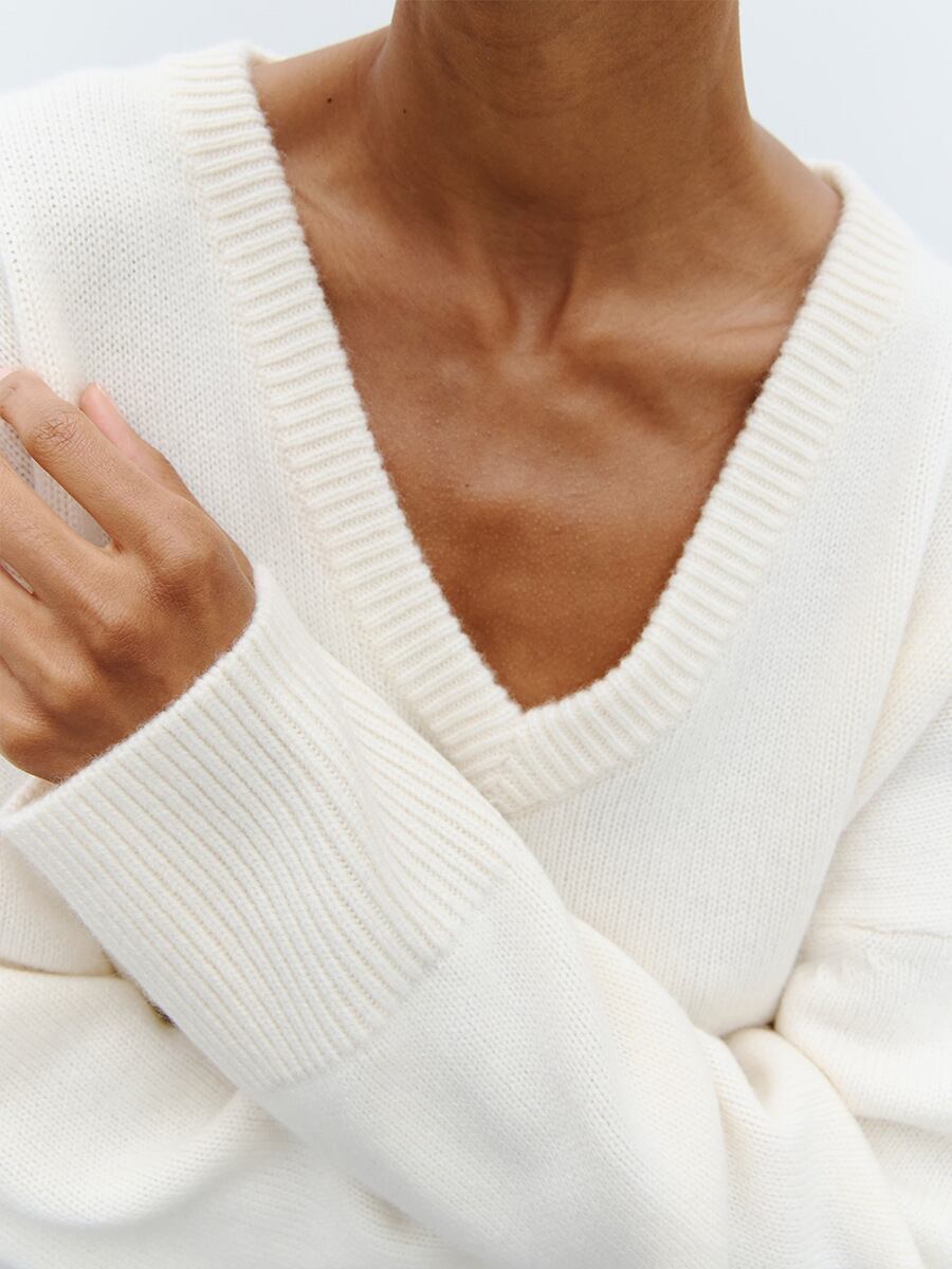 ざっくりとしたVネックにドロップショルダーで抜け感を演出。