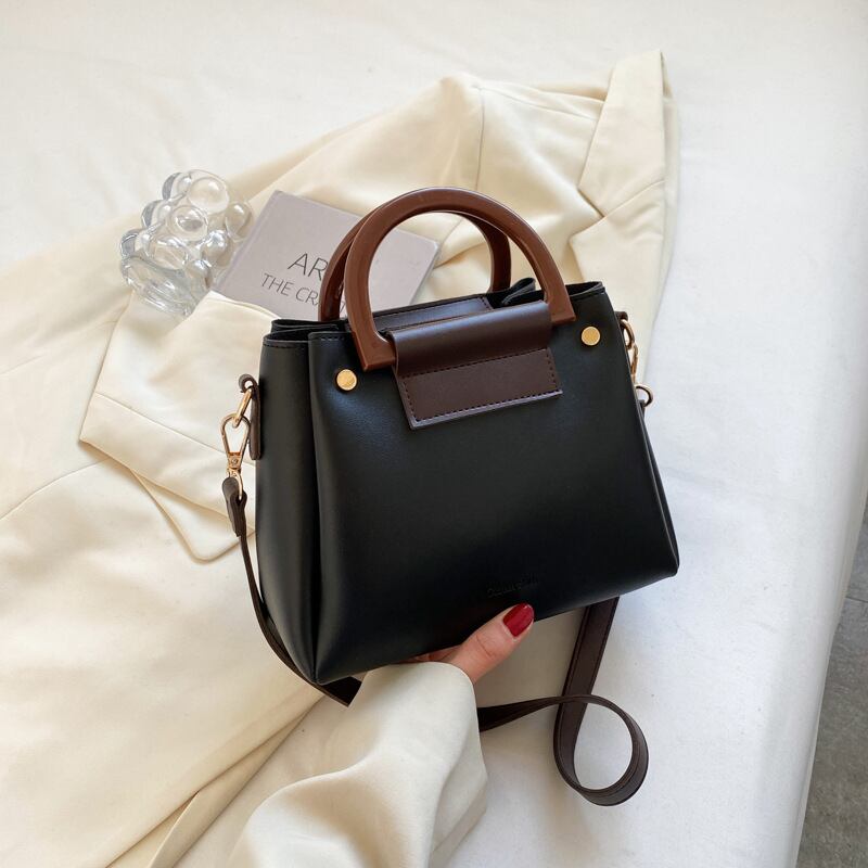 おしゃれなバイカラーデザインで高見えするフェイクレザー素材。