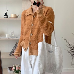リブ切り替えデザインと襟付きのディテールが大人可愛いニットカーディガン。