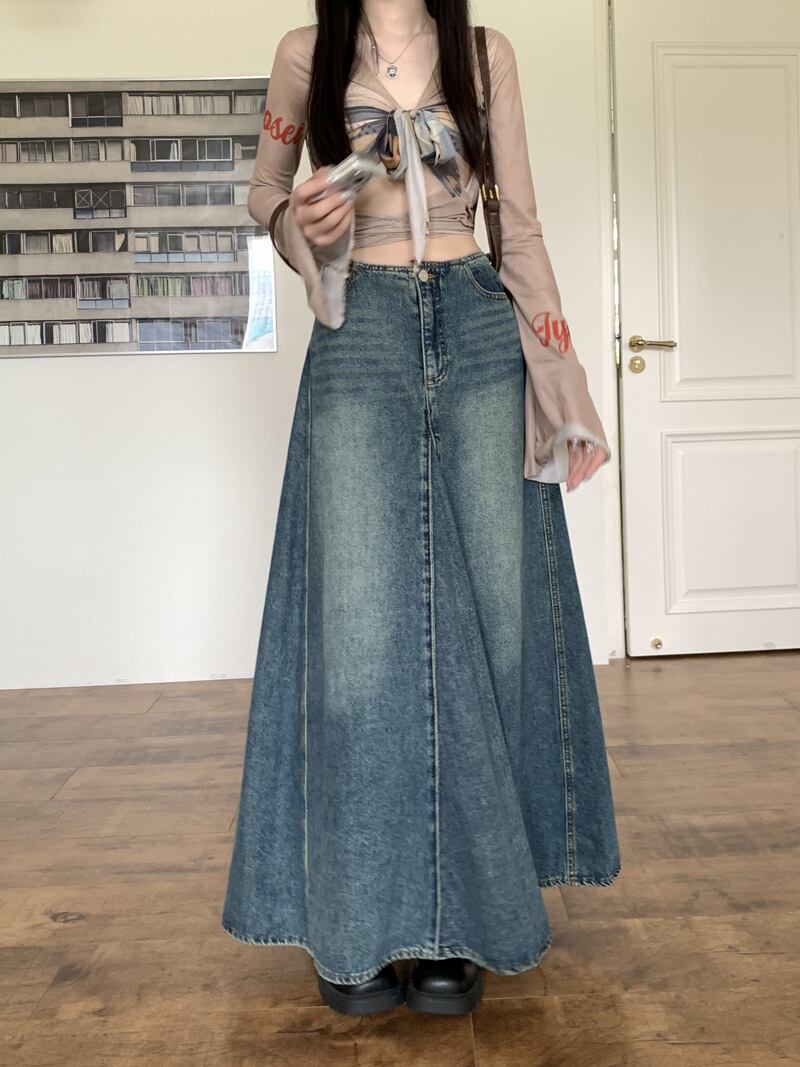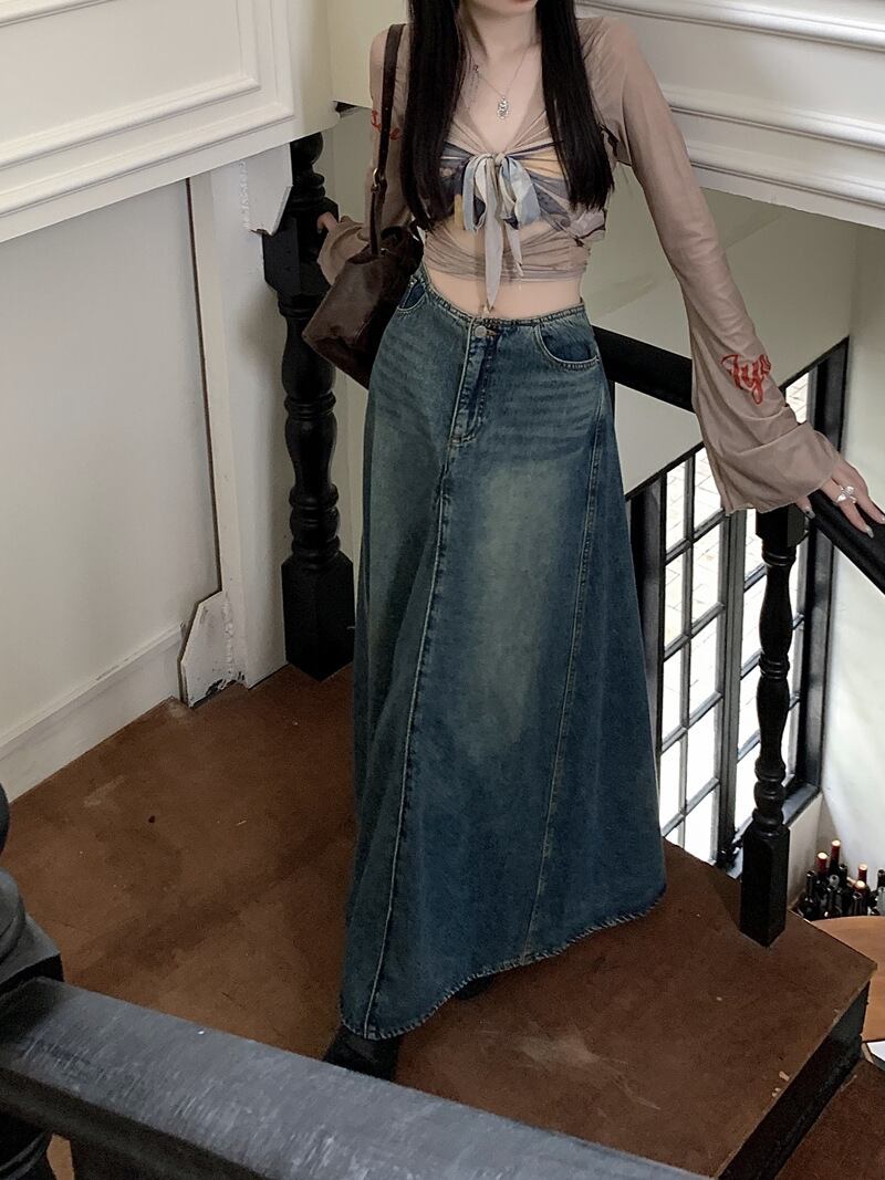 旬なヴィンテージ感のあるウォッシュデニム加工のスカート。