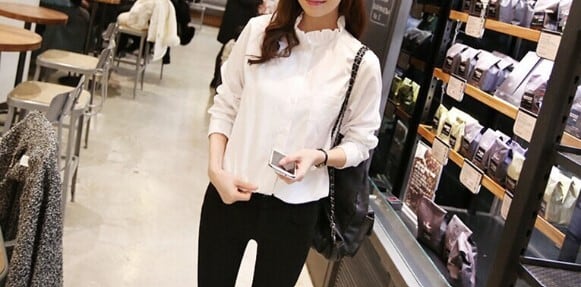 スタンドカラーの襟元がお洒落女子の魅力を一気に倍増してくれます。
