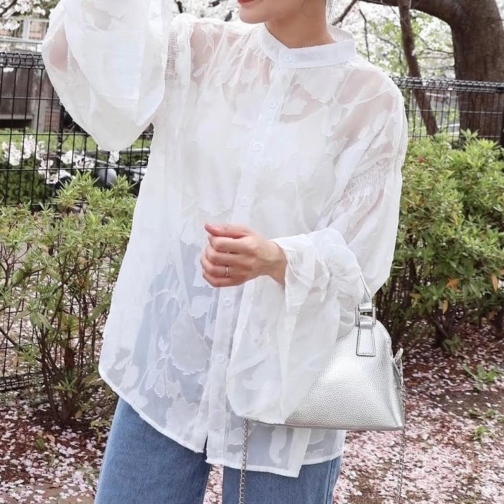 程よい透け感と立体感のある花柄の生地がコーデの主役にフラワージャガードシアーシャツ。